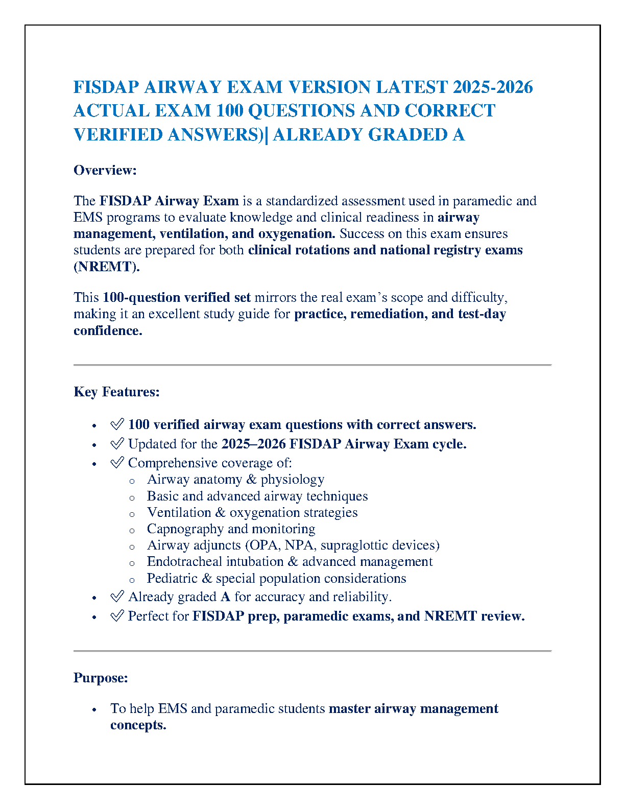 Master the critical skills of airway management and guarantee your success on the FISDAP Airway Exam with our latest 2025-2026 study guide. This comprehensive resource features 100 meticulously verified questions and correct answers, already graded A to ensure accuracy and reliability. Designed to mirror the scope and difficulty of the actual exam, this guide provides in-depth coverage of essential topics, including airway anatomy, ventilation strategies, and advanced techniques. Ideal for paramedic and EMS students aiming to pass their exams on the first try and avoid resits, this study aid is the ultimate tool for NREMT preparation and building test-day confidence.