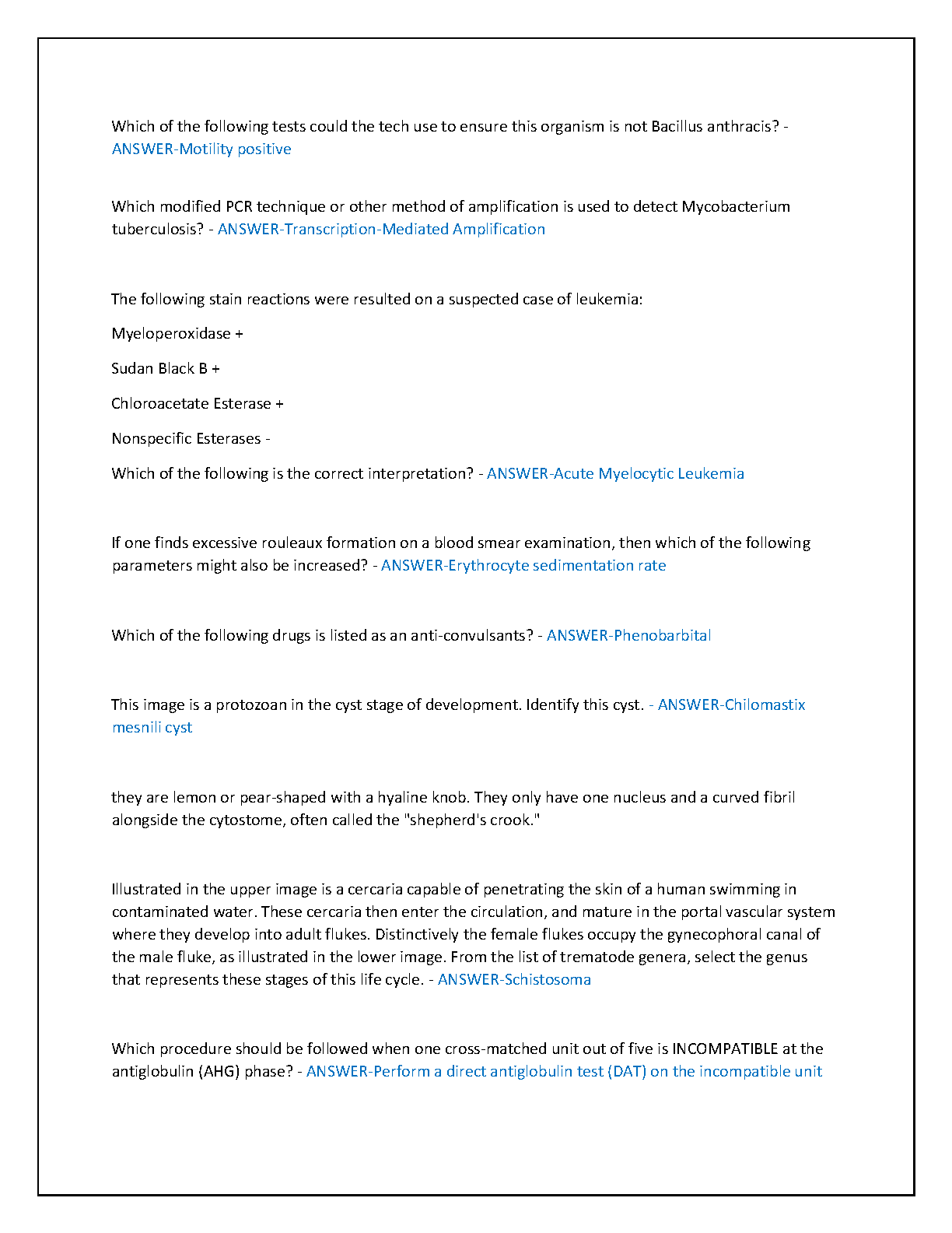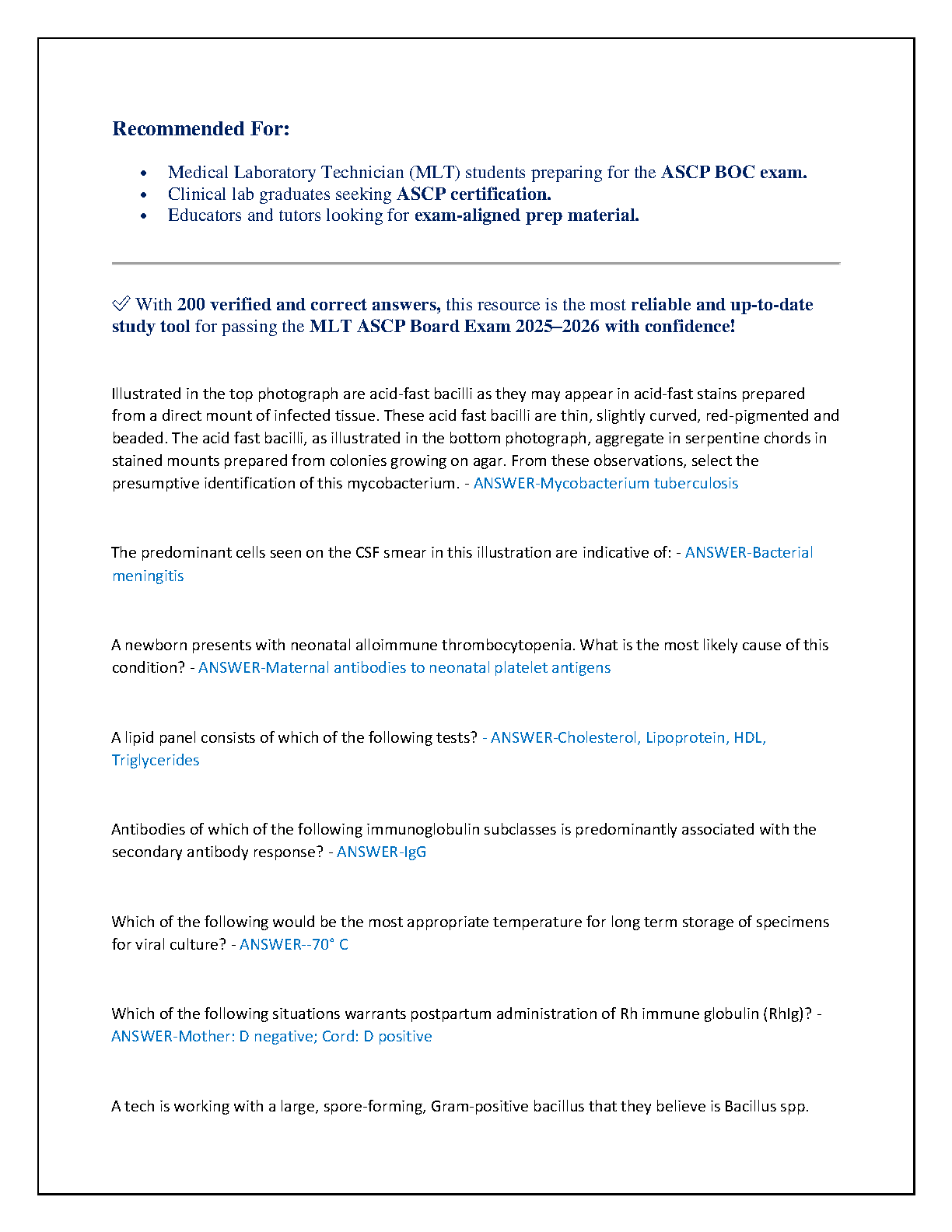 Ace your Medical Laboratory Technician certification with our premier MLT ASCP Board Exam Test Bank for the 2025-2026 testing cycle. This comprehensive resource is expertly designed to ensure you pass on your first attempt. It features 200 meticulously crafted, A-graded questions complete with verified answers, all fully aligned with the latest ASCP exam blueprint. Master all critical testing domains, including Clinical Chemistry, Hematology, Blood Banking, Microbiology, and more. Build your confidence and solidify your knowledge with this essential study tool, your ultimate key to achieving certification success.