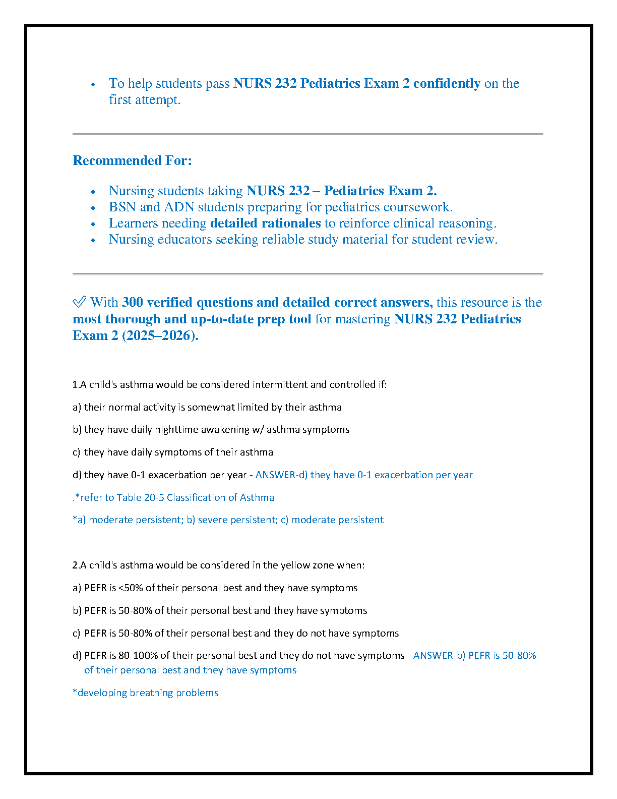 Elevate your study strategy and guarantee success in your pediatric nursing course with our comprehensive Test Bank for NURS 232 PEDS Exam 2. This latest 2025-2026 edition features a bank of 300 meticulously crafted questions, each accompanied by verified answers and detailed rationales to deepen your understanding. This resource is designed to help you master critical topics such as pediatric growth and development, disease management, pharmacology, and family-centered care. Prepare effectively, build confidence, and ace your exams on the first try, while also strengthening your foundation for NCLEX success. Get the A+ grade you deserve!