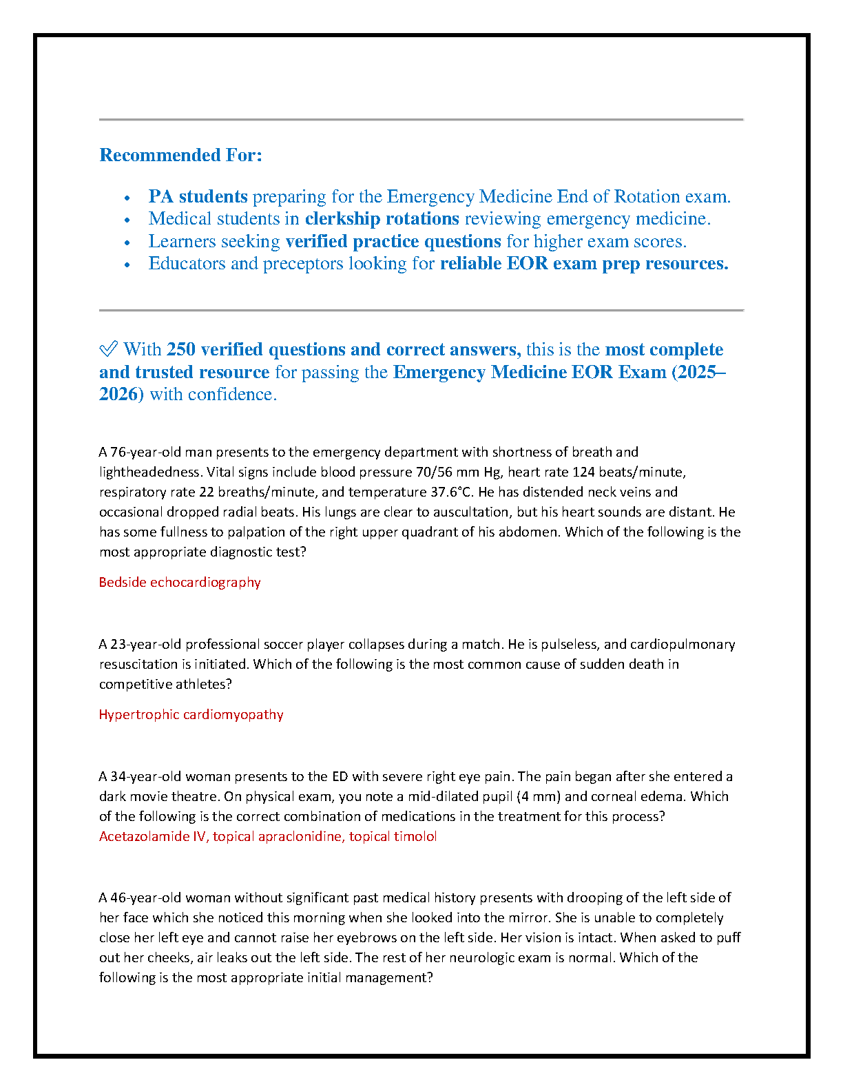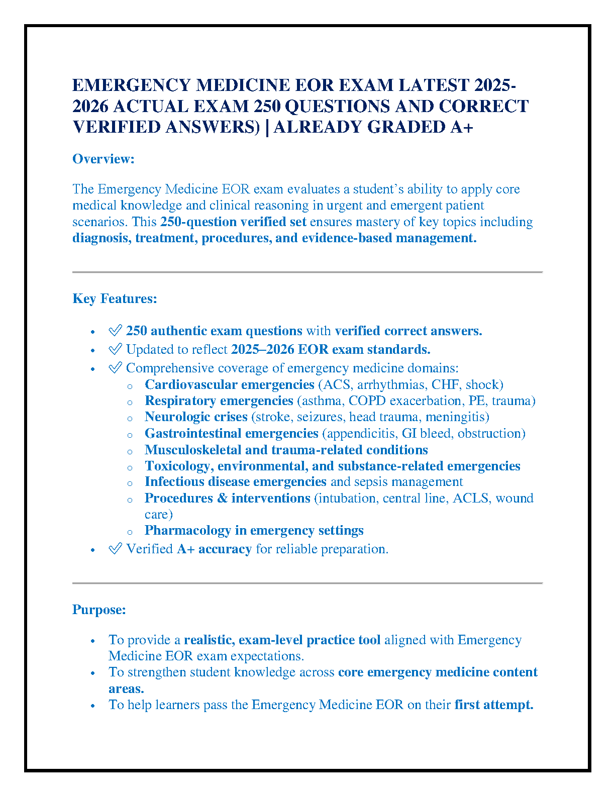 Ace your Emergency Medicine End-of-Rotation (EOR) exam on the first try with our premier 2025-2026 test bank. This guide features 250 authentic exam questions, complete with verified, A+ graded answers, meticulously updated for the latest exam standards. Gain mastery over crucial emergency medicine domains, including cardiovascular and respiratory emergencies, neurologic crises, toxicology, trauma, and more. This realistic practice tool is expertly designed to strengthen your clinical reasoning and core medical knowledge, ensuring you're fully prepared to excel and avoid resits. Get the confidence you need for a top score!