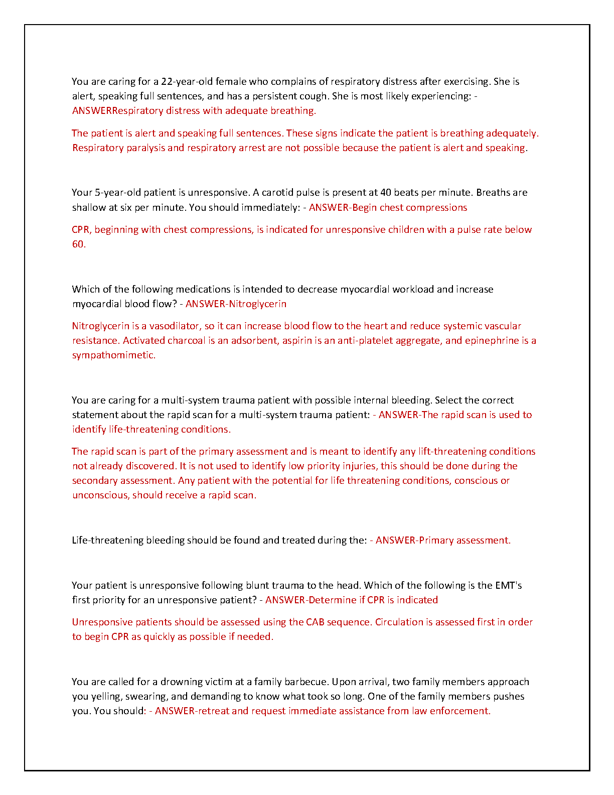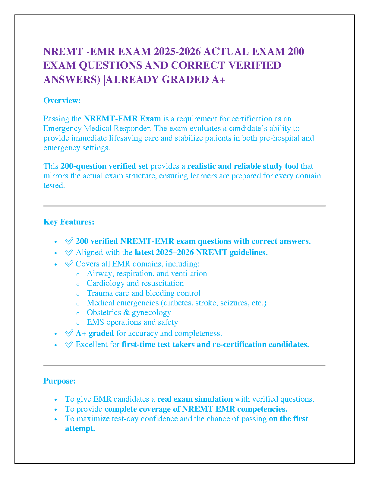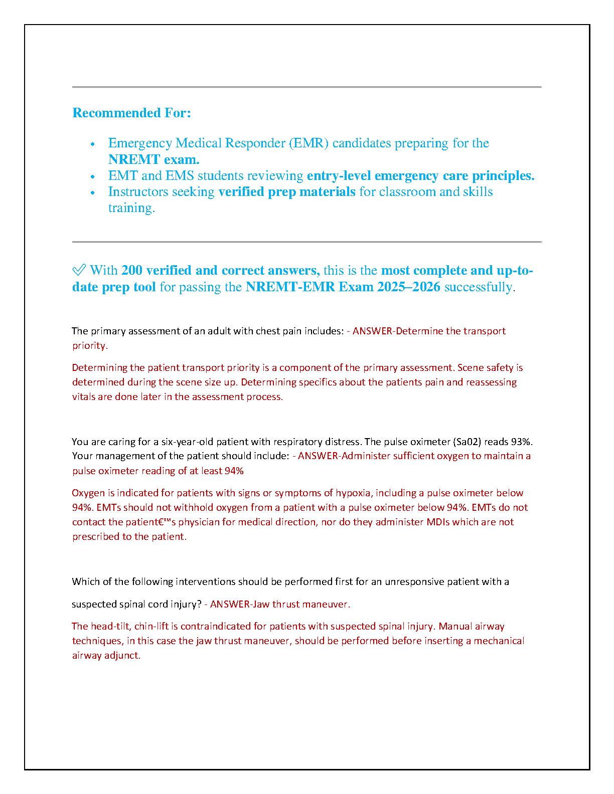 Prepare to excel in your Emergency Medical Responder certification with our comprehensive NREMT-EMR Exam Test Bank for the 2025-2026 academic year. This A+ graded resource is meticulously designed to help you pass on your very first try. Inside, you'll find a complete set of 200 realistic exam questions, each with a correct, verified answer. Our content is fully updated and aligned with the latest 2025-2026 NREMT guidelines, covering all critical EMR domains, including Airway Management, Cardiology, Trauma Care, Medical Emergencies, and EMS Operations. This study tool provides an authentic exam simulation, building your confidence and ensuring you are thoroughly prepared for success. Ideal for both first-time candidates and those seeking re-certification.