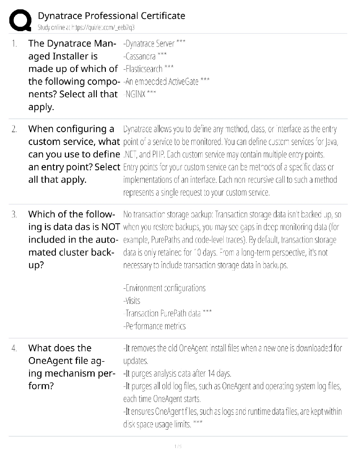 Ace your Dynatrace Professional Certificate exam on the first attempt with this comprehensive test bank. This study guide features a complete collection of verified questions and detailed answers covering crucial topics such as the Dynatrace Managed installer, custom service configuration, automated cluster backups, and the OneAgent mechanism. Designed to mirror the real exam, this resource provides the essential practice you need to master the material and earn your certification with confidence.