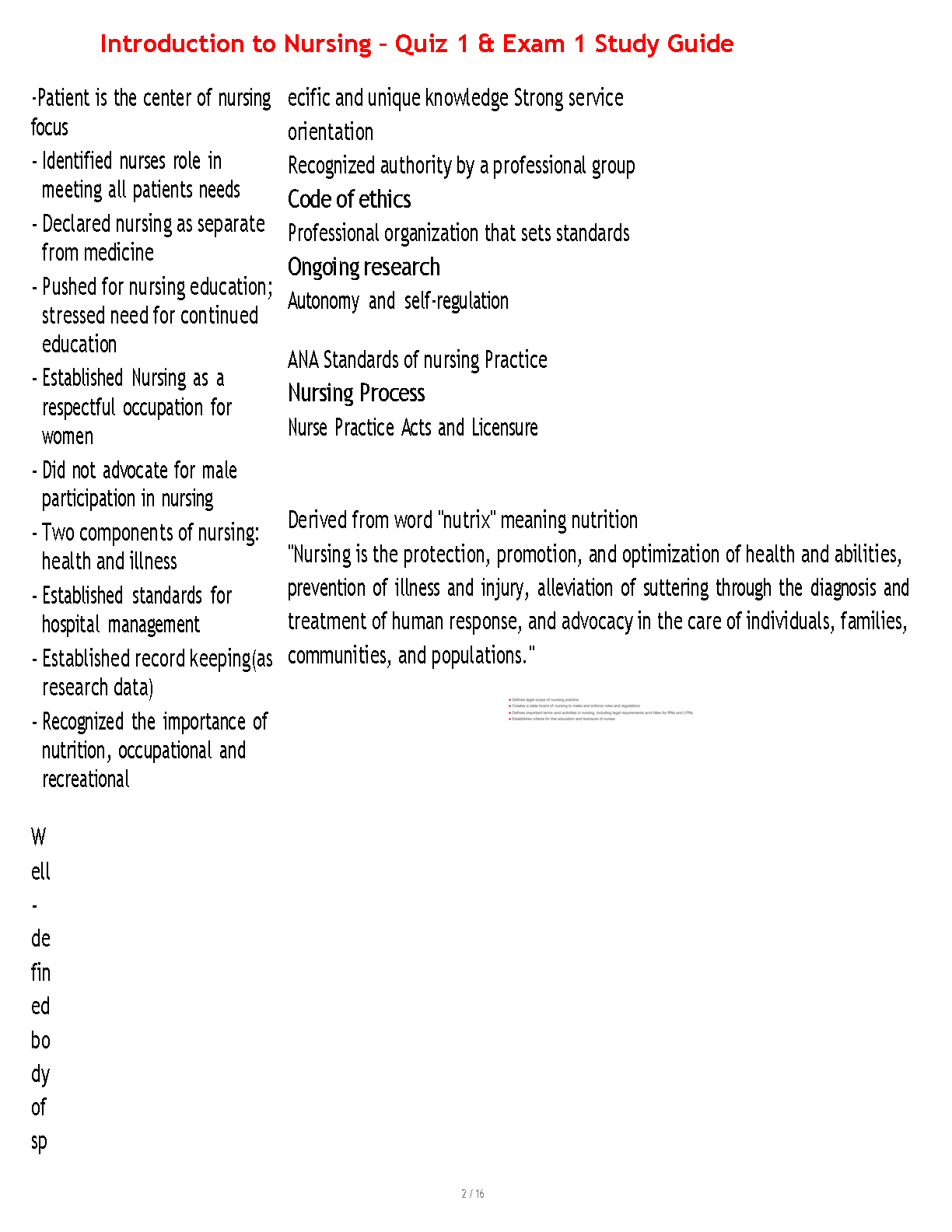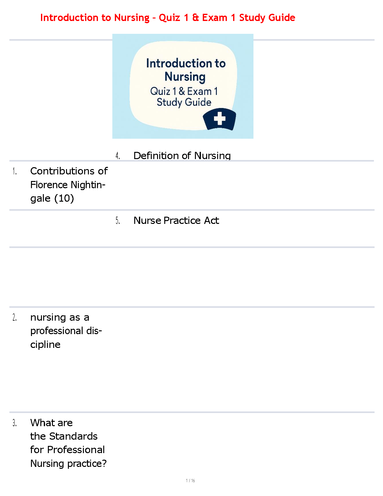 Unlock success in your nursing journey with our comprehensive study guide for 'Introduction to Nursing.' This 2025/2026 resource is expertly designed to help you master the material for Quiz 1 and Exam 1, ensuring you pass on your first try. This 16-page guide provides detailed notes on foundational topics including the pivotal contributions of Florence Nightingale, the definition of nursing as a professional discipline, the essential Standards for Professional Nursing Practice, and the Nurse Practice Act. Avoid resits and build a strong foundation for your nursing career with this essential study tool.