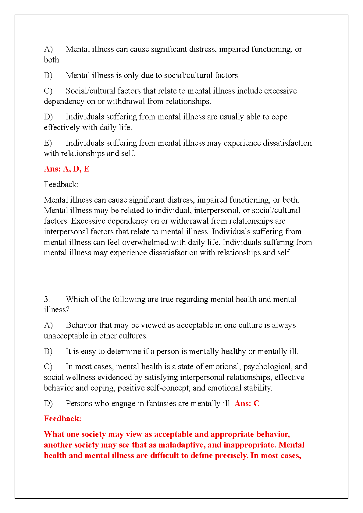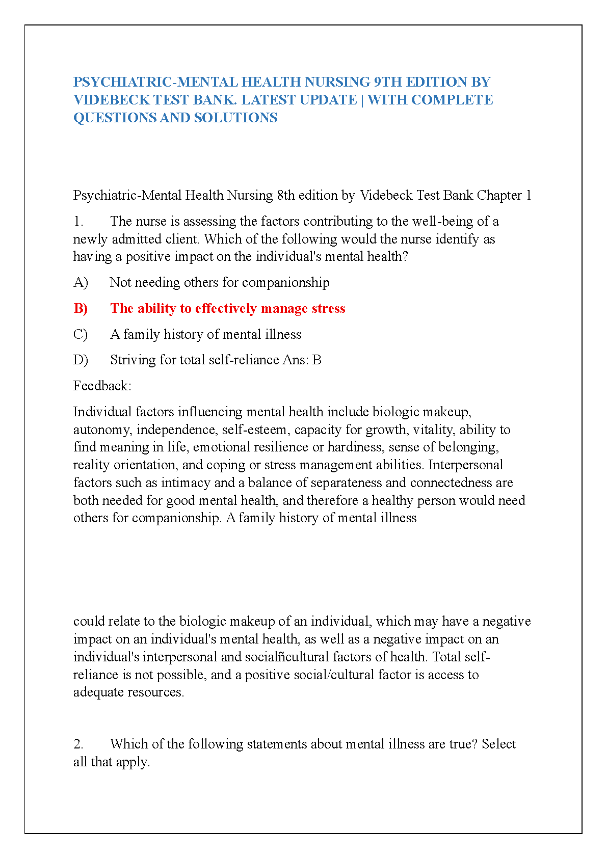 Master your psychiatric nursing course with the complete Test Bank for Sheila L. Videbeck's 'Psychiatric-Mental Health Nursing,' 9th Edition. This essential study guide features a comprehensive collection of exam questions, detailed answers, and thorough rationales covering all key topics. It's the ultimate resource designed to help you deepen your understanding, prepare effectively for exams, and achieve success in your nursing program. Instantly download this invaluable tool to boost your confidence and ace your mental health nursing assessments.