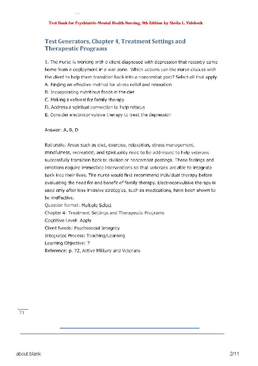 Master your Psychiatric-Mental Health Nursing course with this essential Test Bank for the 9th Edition by Sheila L. Videbeck. This digital resource offers an extensive collection of exam-style questions and verified answers, covering every key concept from the textbook. It's meticulously designed to help you prepare effectively for your exams, test your knowledge, and understand the rationale behind each answer. Unlock your potential and achieve academic success with this indispensable study companion, your key to acing the course and building a strong foundation for your nursing career.