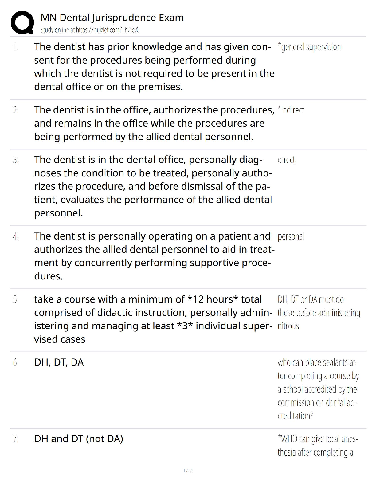 Get ready to conquer the MN Dental Jurisprudence Exam with our latest 2025/2026 Test Bank. This essential study resource is packed with detailed questions and verified answers, covering all critical topics you'll face on the test. Master concepts like levels of supervision (general, indirect, direct, personal), scope of practice for DH, DT, and DA, and specific regulations for procedures such as administering nitrous oxide and local anesthesia. Designed to mirror the actual exam format, this guide provides the practice you need to build confidence and ensure you pass on your very first try, avoiding costly and time-consuming resits. Start your successful career in Minnesota's dental field today!