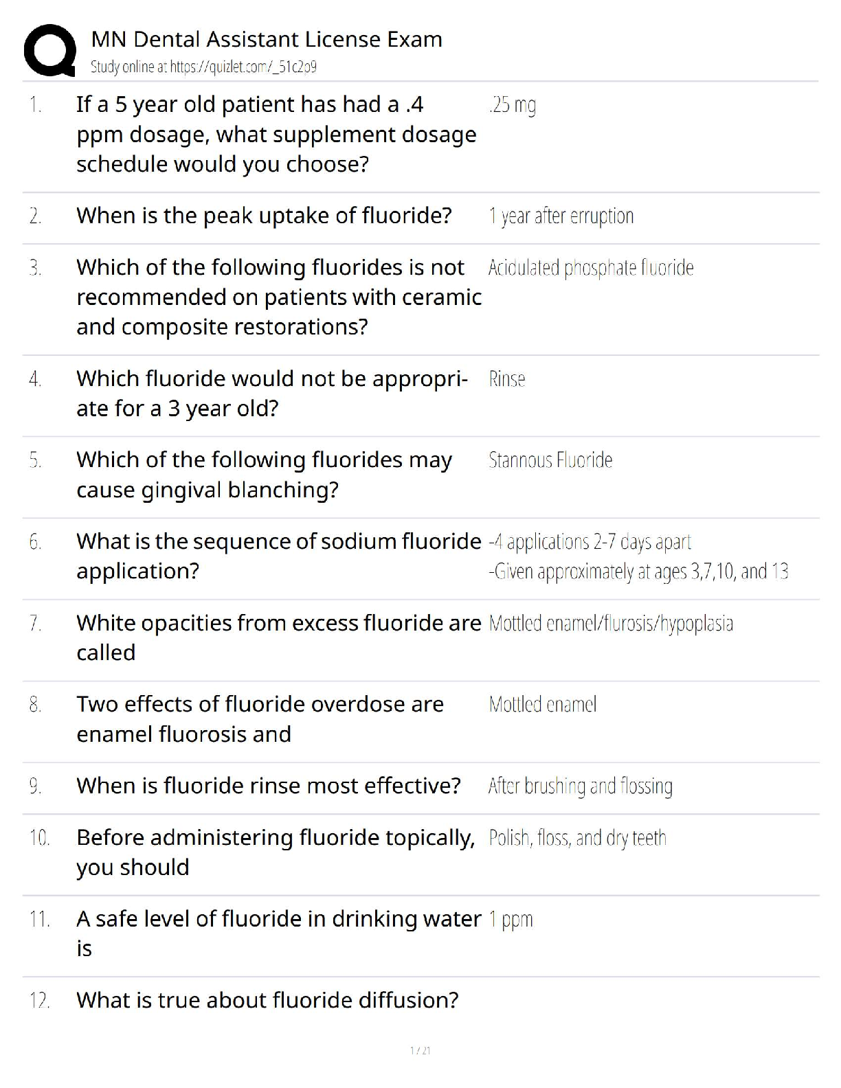 Unlock your career as a dental assistant with our premier test bank for the MN Dental Assistant License Exam, fully updated for the 2025/2026 academic year. This comprehensive resource is meticulously designed with a vast collection of practice questions and verified answers, covering all critical topics including fluoride application, patient safety, and dental procedures. Stop worrying about resits and gain the confidence to ace your exam on the very first attempt. Our study guide is your key to mastering the material and securing your license efficiently.