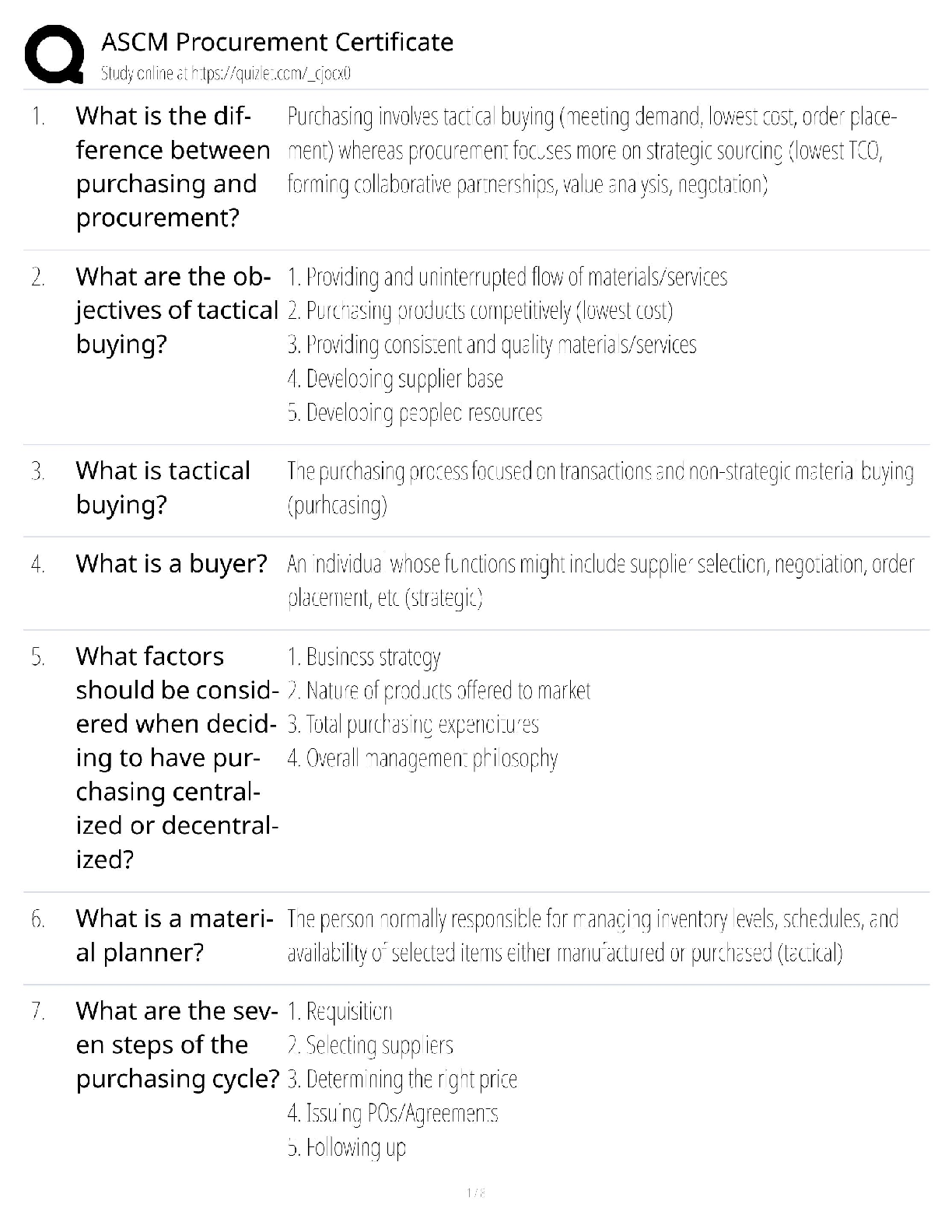 Ace your ASCM Procurement Certificate exam with our comprehensive 2025/2026 test bank. This essential study guide features a complete collection of practice questions and detailed, verified answers covering all critical topics. Master key concepts such as the distinction between purchasing and procurement, the objectives of tactical buying, the seven steps of the purchasing cycle, and strategic decision-making in centralization. Designed to help you study efficiently and pass on your first attempt, this exam prep resource is your key to achieving your ASCM certification.