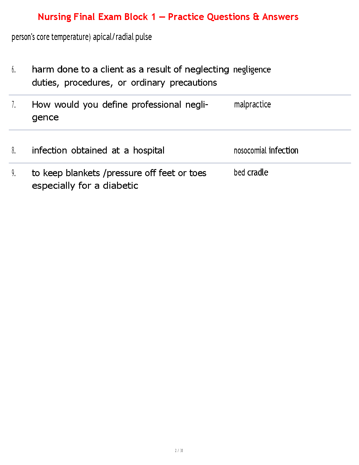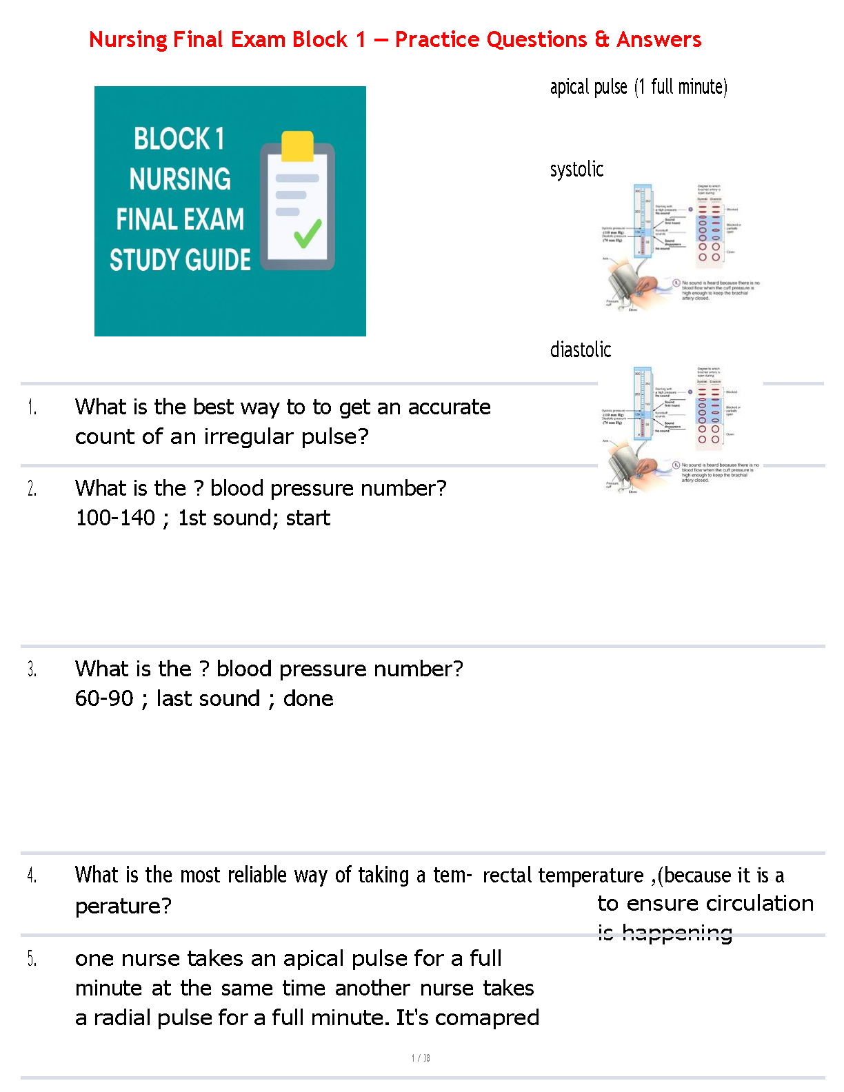 Prepare to excel in your nursing finals with our latest 2025/2026 study guide for Block 1. This comprehensive resource features a curated set of practice questions and verified answers, focusing on core nursing fundamentals. Gain mastery over essential skills such as measuring apical pulse for irregular heartbeats, differentiating between systolic and diastolic pressures, and understanding best practices for temperature assessment. Designed to boost your confidence and ensure you pass on your first attempt, this guide is the perfect tool to avoid resits and achieve top grades.
