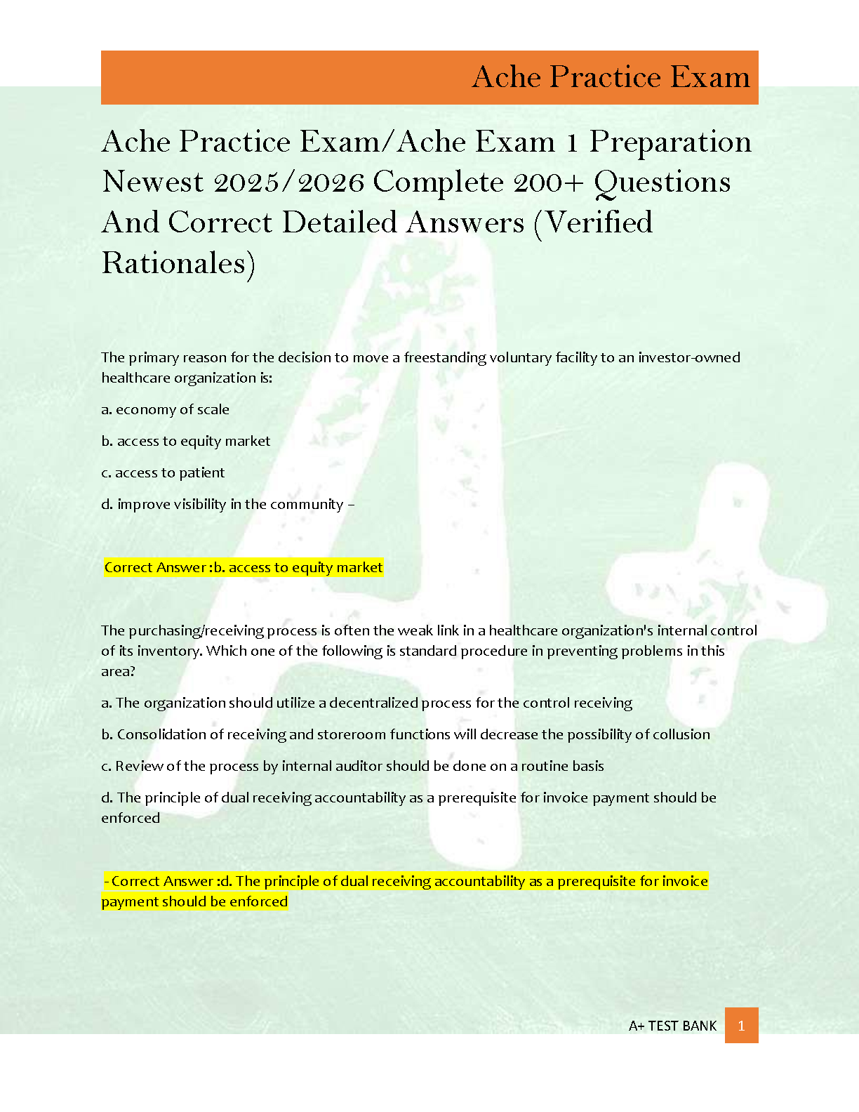 Master your ACHE Board of Governors Exam with our comprehensive Test Bank for the 2025/2026 academic year. This essential study tool features over 200 practice questions, each accompanied by correct answers and in-depth, verified rationales. Designed to mirror the actual exam format, this resource helps you identify your strengths and weaknesses, understand complex healthcare management concepts, and build the confidence needed to succeed. Get immediate access to a proven study guide and take the first step towards becoming a Fellow of the American College of Healthcare Executives (FACHE).