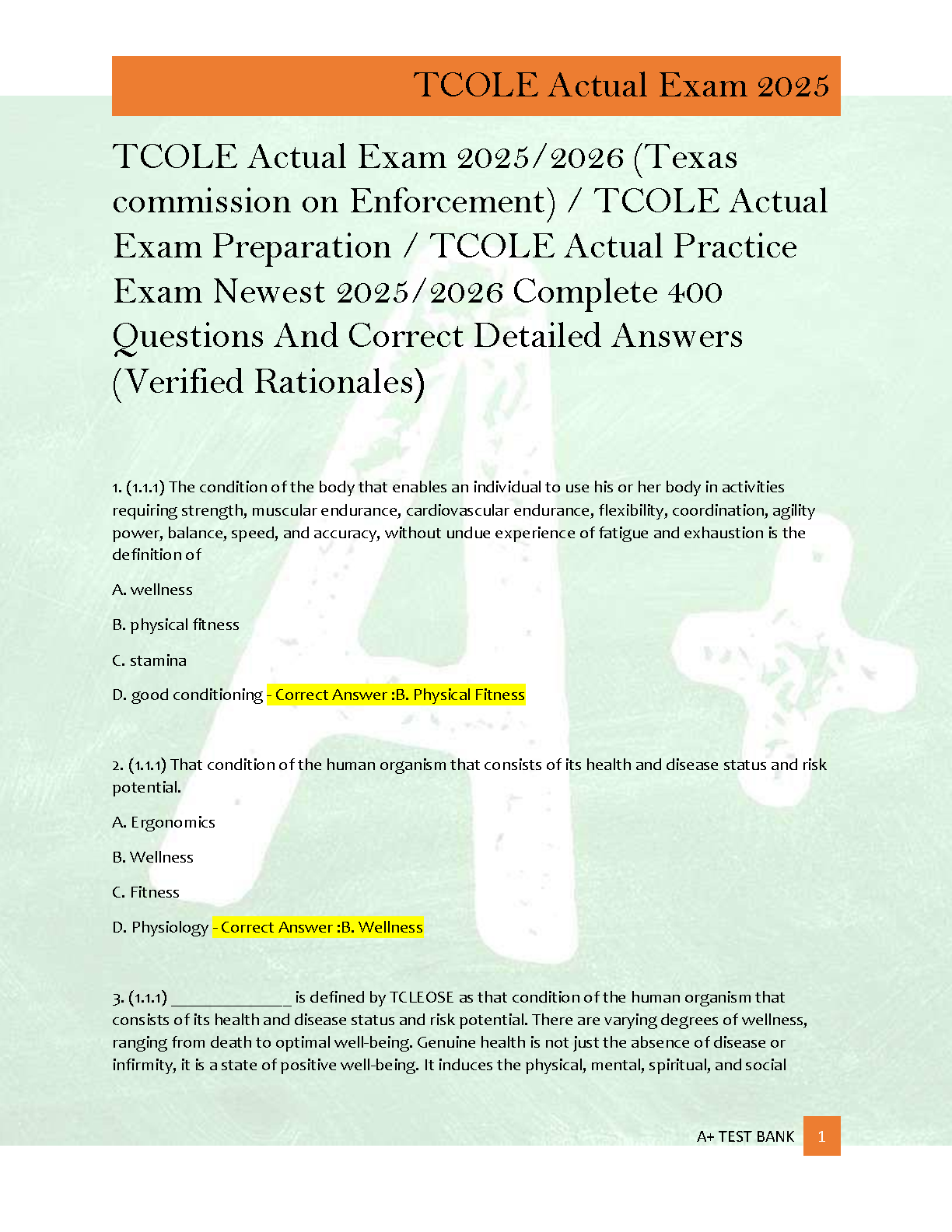 Prepare to pass your Texas Commission on Law Enforcement (TCOLE) exam on the very first attempt! This essential 2025/2026 study guide is a complete test bank featuring 400 practice questions meticulously crafted to mirror the actual TCOLE exam. Each question comes with a correct, detailed answer and a verified rationale, ensuring you not only know the right answer but also understand the core concepts behind it. Avoid resits and fast-track your law enforcement career in Texas with this A+ graded resource.