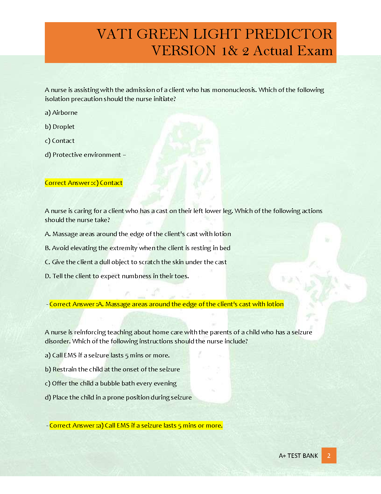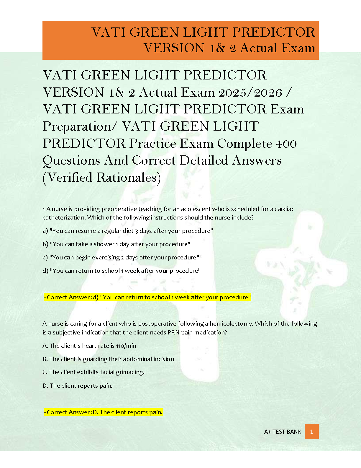 VATI Green Light Predictor Version 1 & 2 Test Bank by ATI Nursing Education | 400 Questions and Verified Rationales