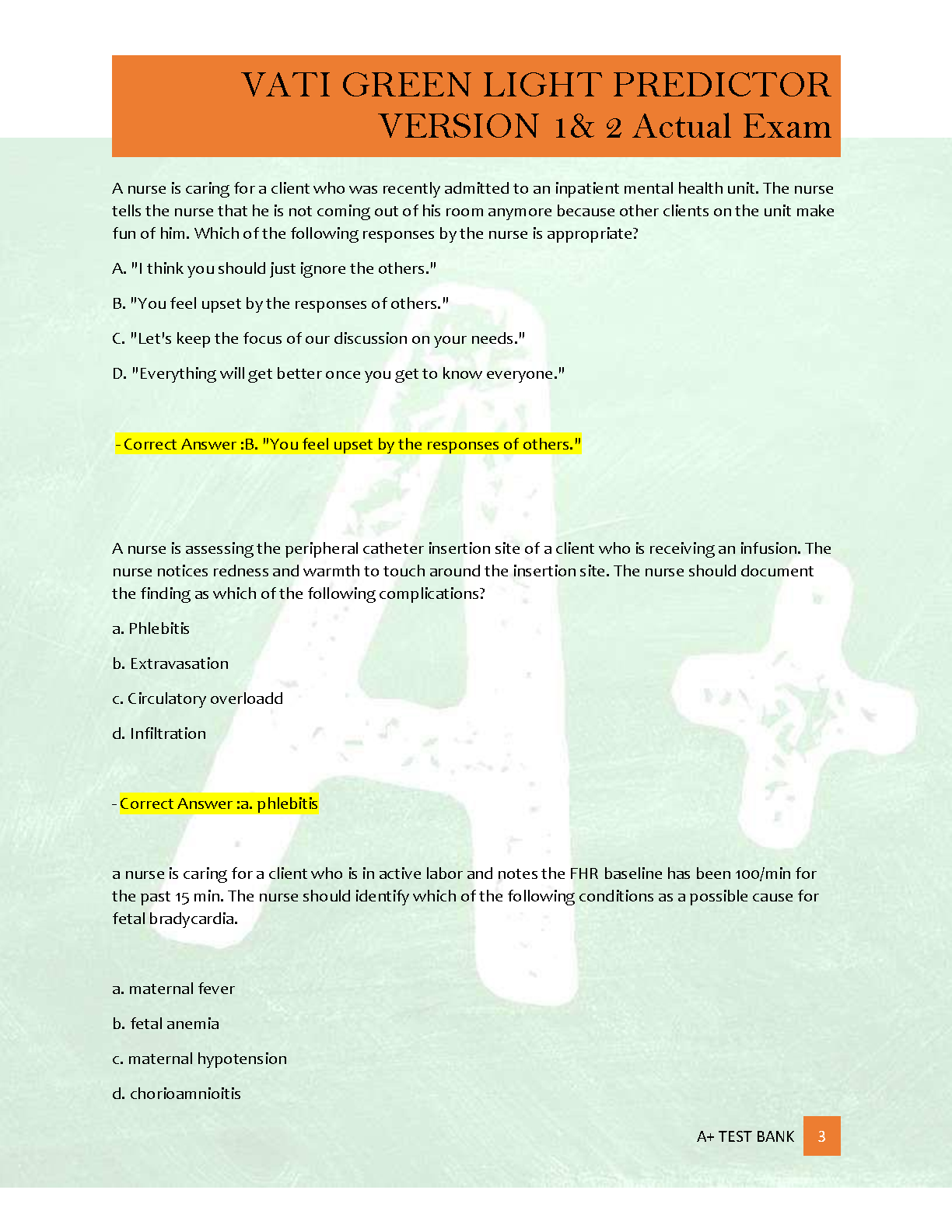 Ace your nursing exams with the comprehensive VATI Green Light Predictor Test Bank, covering both Version 1 and Version 2. This essential study guide, developed by ATI Nursing Education, features a complete set of 400 practice questions. Each question comes with a correct, detailed answer and a verified rationale to deepen your understanding of key nursing concepts. This resource is expertly designed to help you master the material, build confidence, and successfully pass your VATI Green Light Predictor exam. Get immediate access to this complete Q&A bank and start your journey towards nursing excellence today.