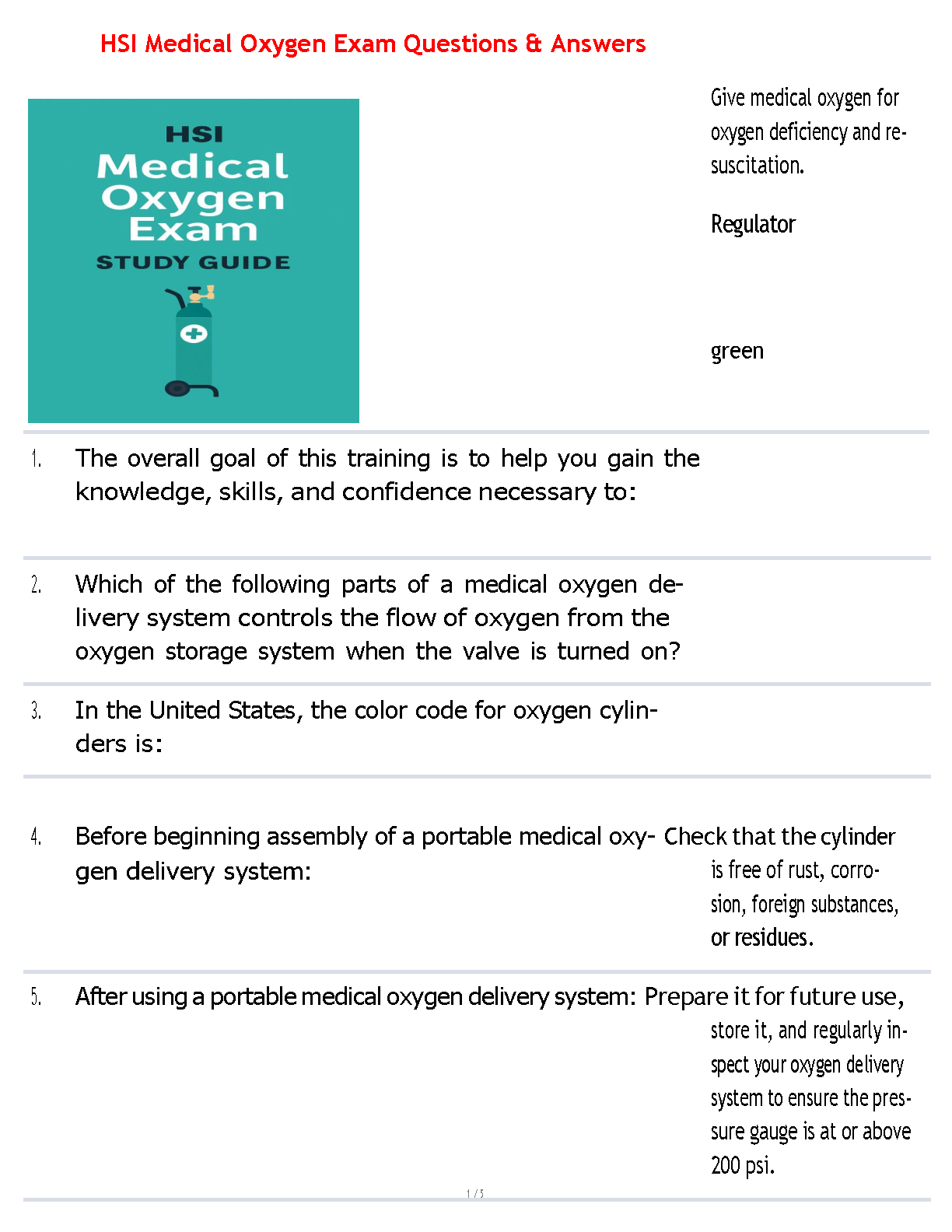Ace your HSI Medical Oxygen certification with our comprehensive test bank, developed by the Health and Safety Institute. This study guide features an extensive collection of real exam questions and 100% correct, verified answers. Master key concepts such as oxygen administration for deficiency and resuscitation, components of delivery systems like regulators, and critical safety protocols including US color codes for oxygen cylinders. Our HSI Medical Oxygen Exam Q&A is the ultimate tool to build your knowledge, skills, and confidence, ensuring you pass on your first attempt. Download now and get certified!