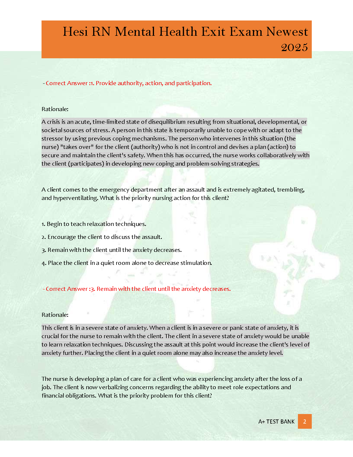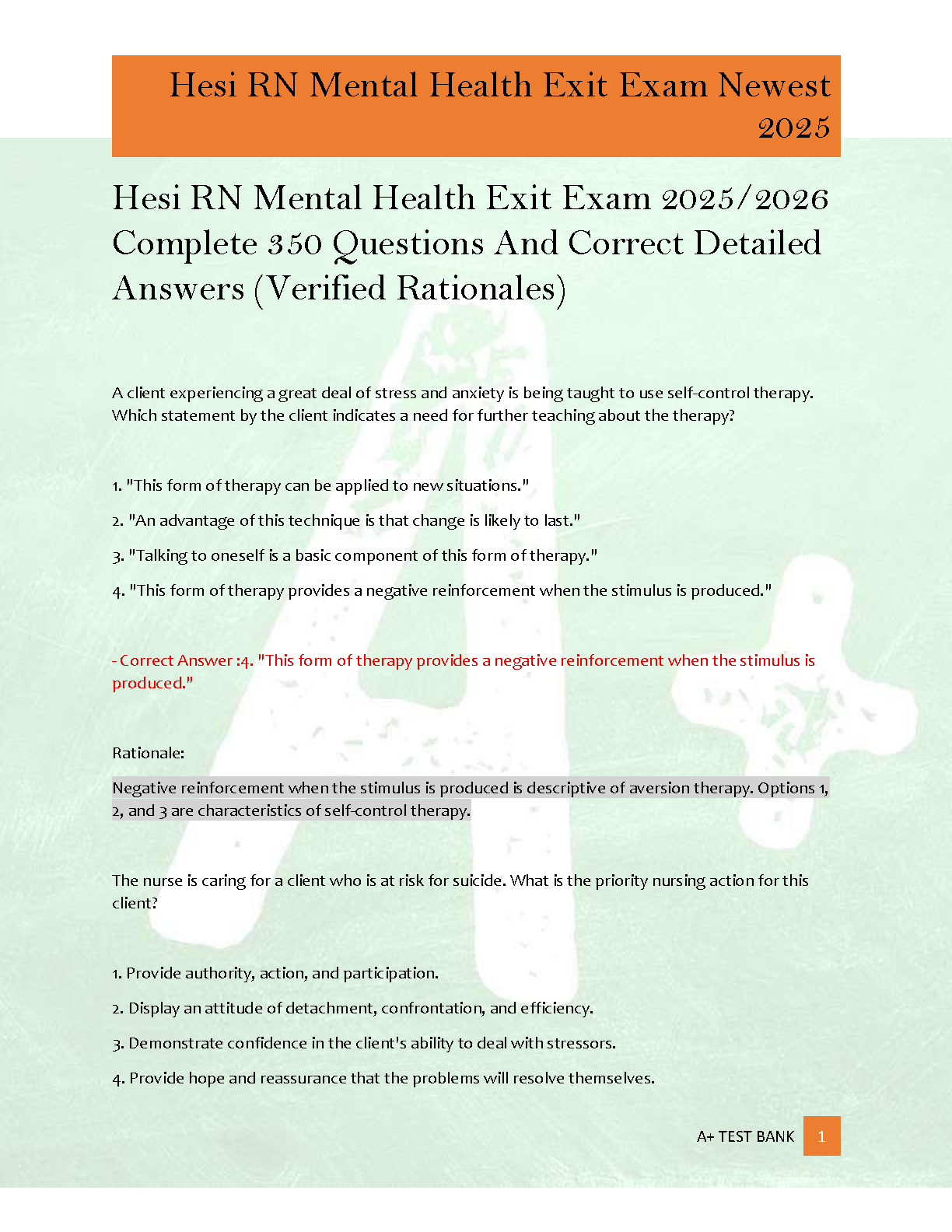 Master the HESI RN Mental Health Exit Exam and pass on your first attempt with our newly released 2025/2026 test bank. This essential study guide features 350 complete questions paired with correct, detailed answers and verified rationales. Designed to build your confidence and ensure success, this resource is your ultimate tool for avoiding resits and acing your mental health nursing exam.