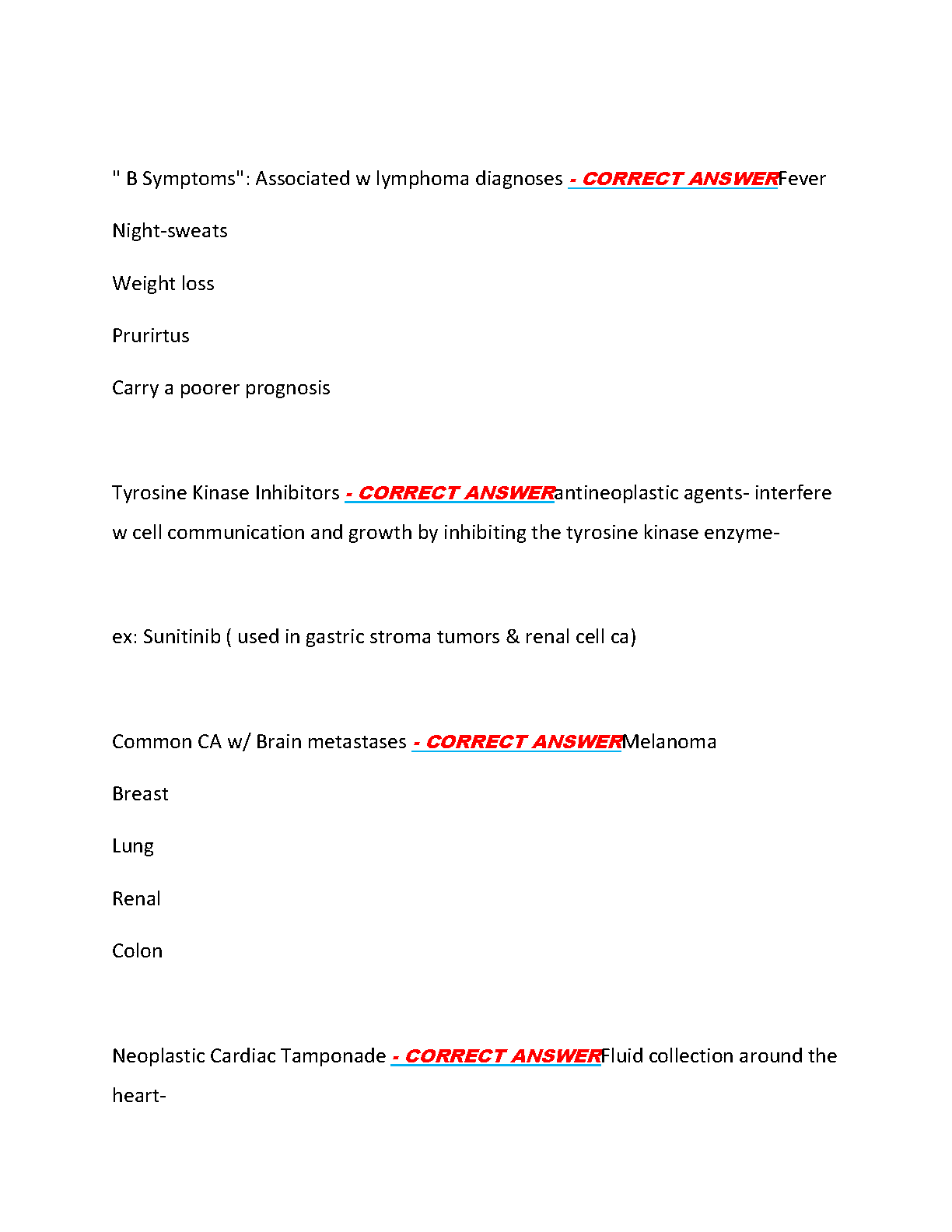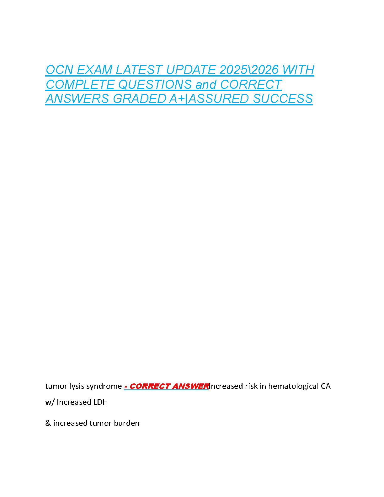 Master the OCN (Oncology Certified Nurse) exam with our latest 2025/2026 test bank. This comprehensive resource is packed with a wide range of practice questions and meticulously verified correct answers, covering all essential topics you'll face on the actual certification test. Designed to ensure you achieve a top score (Graded A+), this study guide provides the in-depth preparation needed to pass with confidence and earn your OCN credential. Don't leave your success to chance; equip yourself with the best tools for assured success.