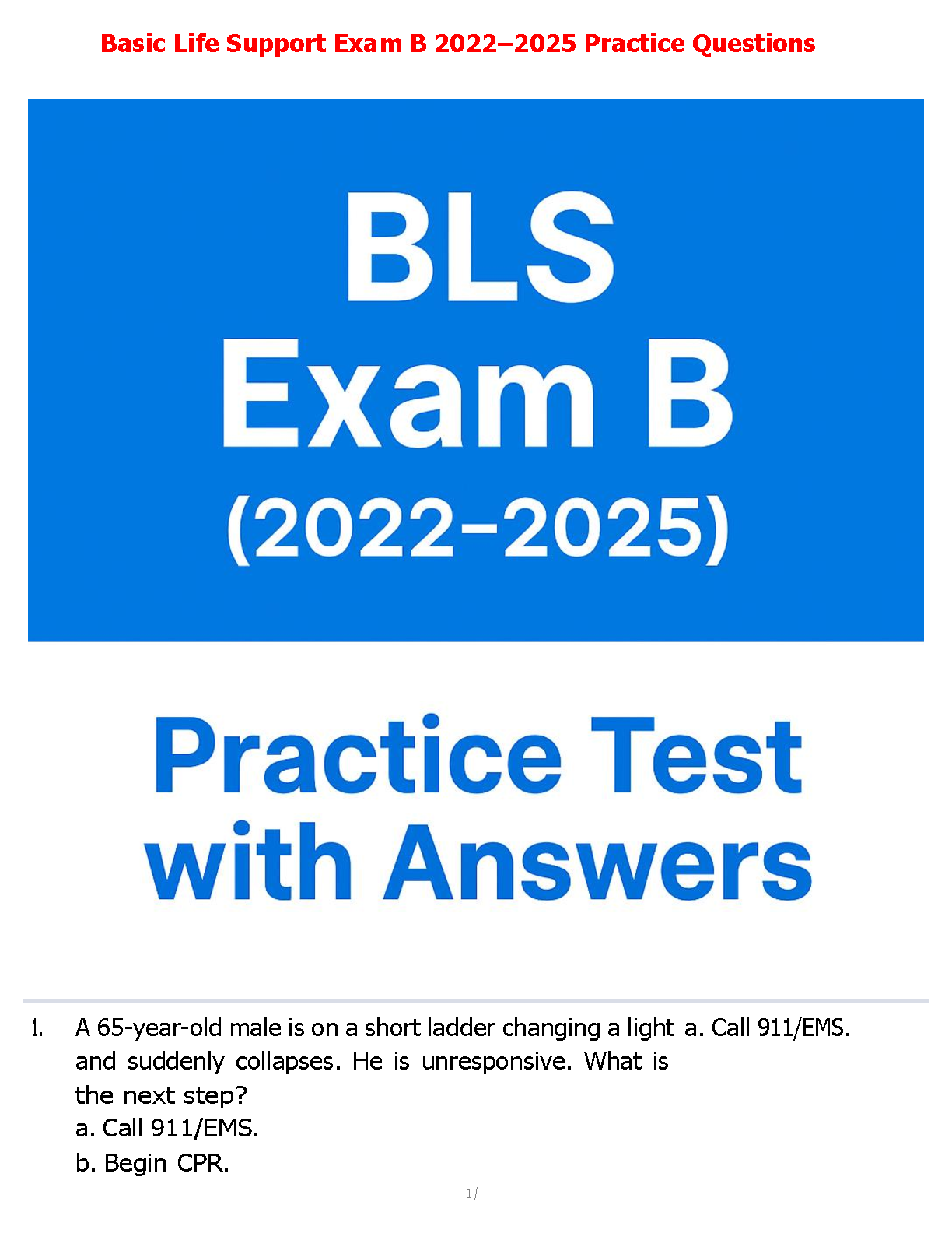 Get ready to ace your Basic Life Support (BLS) certification with our comprehensive test bank for Exam B, valid for 2022-2025. This essential study guide, based on the latest American Heart Association (AHA) guidelines, is packed with realistic practice questions and detailed, verified answers. It's the perfect tool for healthcare professionals and students looking to master key concepts, from CPR techniques to emergency response scenarios. Prepare effectively, build your confidence, and pass your BLS exam on the first try. This resource is your key to success for the 2025/2026 academic year and beyond.