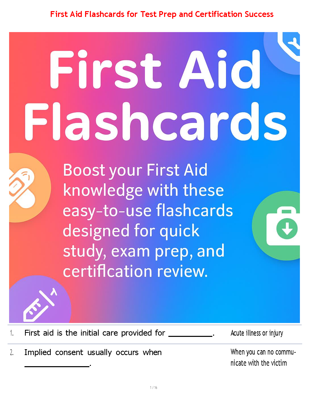 Are you preparing for your First Aid certification exam? Eliminate exam anxiety and avoid costly resits with our comprehensive 2025/2026 First Aid Flashcard set. This meticulously curated collection of easy-to-use flashcards is your key to mastering essential concepts quickly and efficiently. Each card covers a critical topic, from initial patient assessment and implied consent to treating acute illnesses and injuries. Designed for rapid learning and knowledge retention, this study guide is the perfect tool for your exam prep, ensuring you have the confidence and knowledge to pass on your very first try. Download now and take the first step towards certification success!