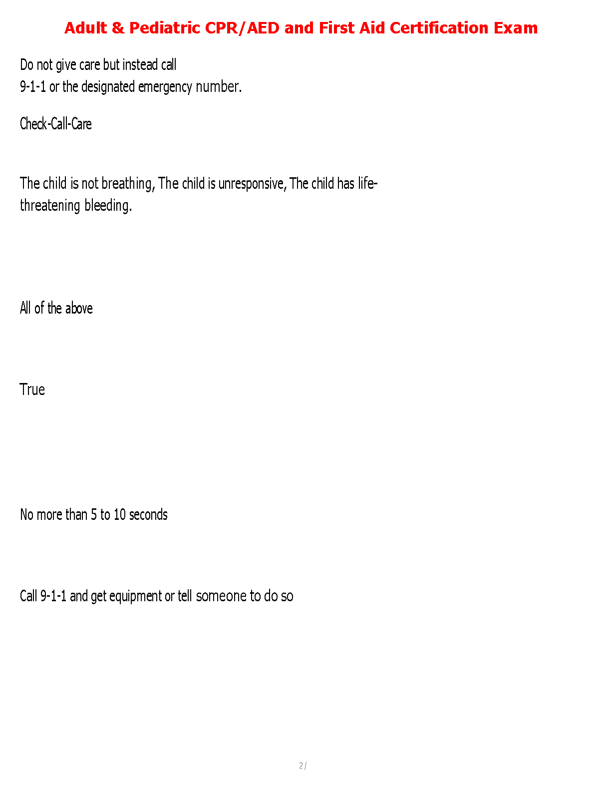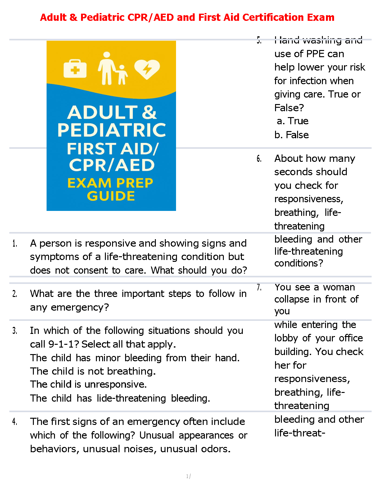 Adult & Pediatric CPR/AED and First Aid Certification Exam Test Bank with Questions and Correct Answers