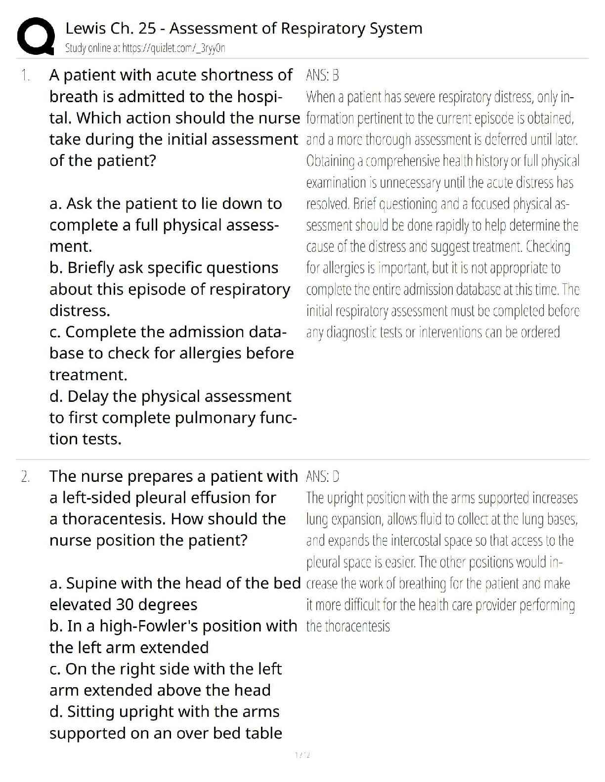 Master the essential nursing skills for respiratory system assessment with this comprehensive test bank for Chapter 25 of Lewis's Medical-Surgical Nursing, 12th Edition. This study resource features a complete collection of multiple-choice questions, each with a detailed rationale, covering critical topics such as prioritizing care in acute respiratory distress, proper patient positioning for procedures like thoracentesis, and initial patient assessments. Designed to sharpen your clinical judgment and critical thinking, this test bank is the perfect tool for nursing students aiming to excel in their coursework and pass their exams with confidence.