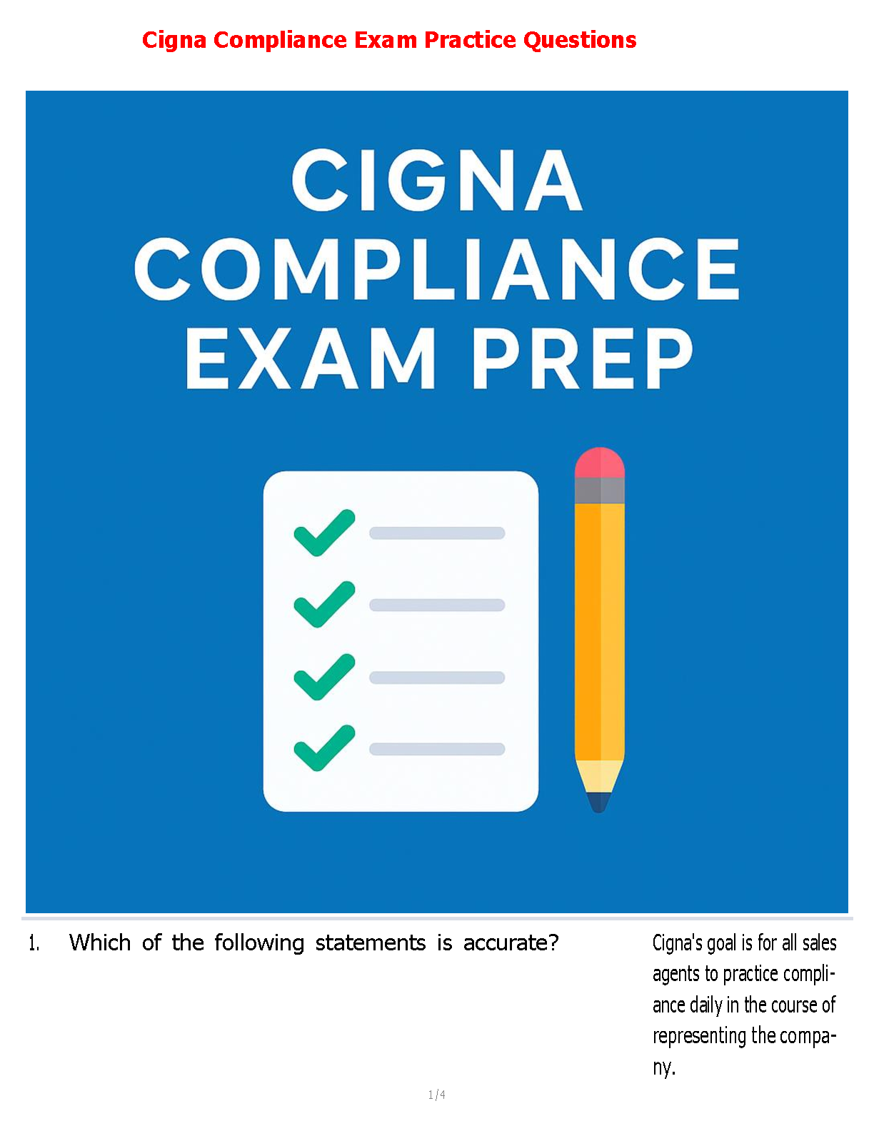 Master the Cigna Compliance Exam with our newly updated 2025/2026 Test Bank. This essential study guide is meticulously designed to help you pass on your first attempt, eliminating the need for costly and time-consuming resits. Inside, you'll find an extensive collection of practice questions and detailed, verified answers that cover all critical areas of the Cigna compliance requirements. Prepare effectively, build your confidence, and secure your certification with the most reliable exam prep resource available.