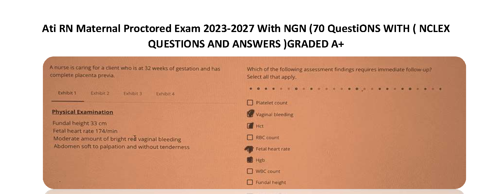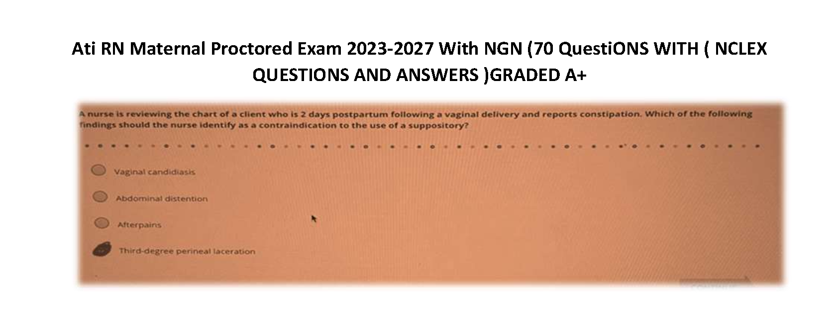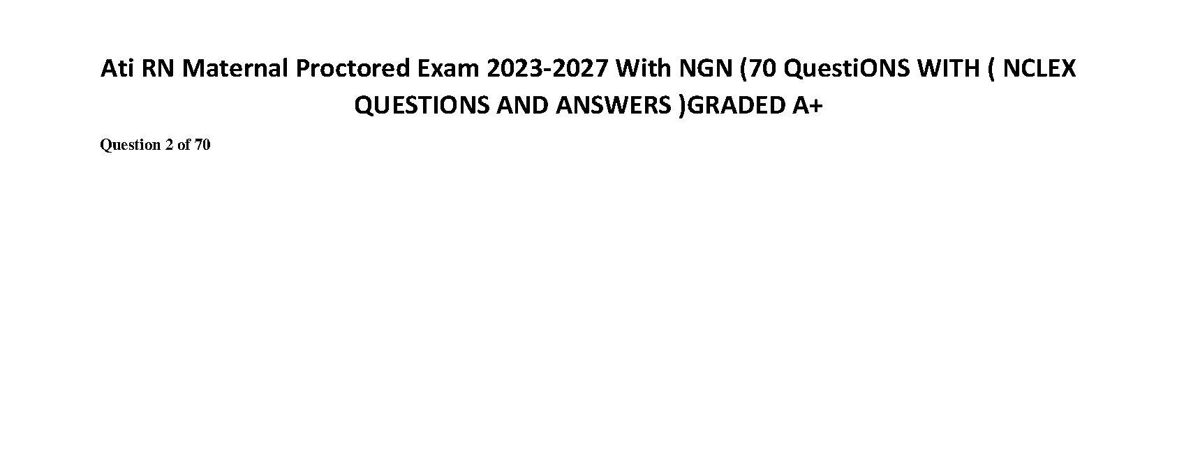 Struggling with the ATI RN Maternal Proctored Exam? Get the ultimate advantage with our comprehensive test bank for the 2023-2027 curriculum. This A+ graded resource features 70 meticulously crafted questions and answers, fully updated to the Next Generation NCLEX (NGN) format. Each question comes with a detailed rationale to deepen your understanding of key maternal nursing concepts. Designed to mirror the actual proctored exam, this study guide helps you master complex topics, build critical thinking skills, and walk into your test with confidence. Pass on your first attempt and avoid resits by preparing with the best-rated materials.