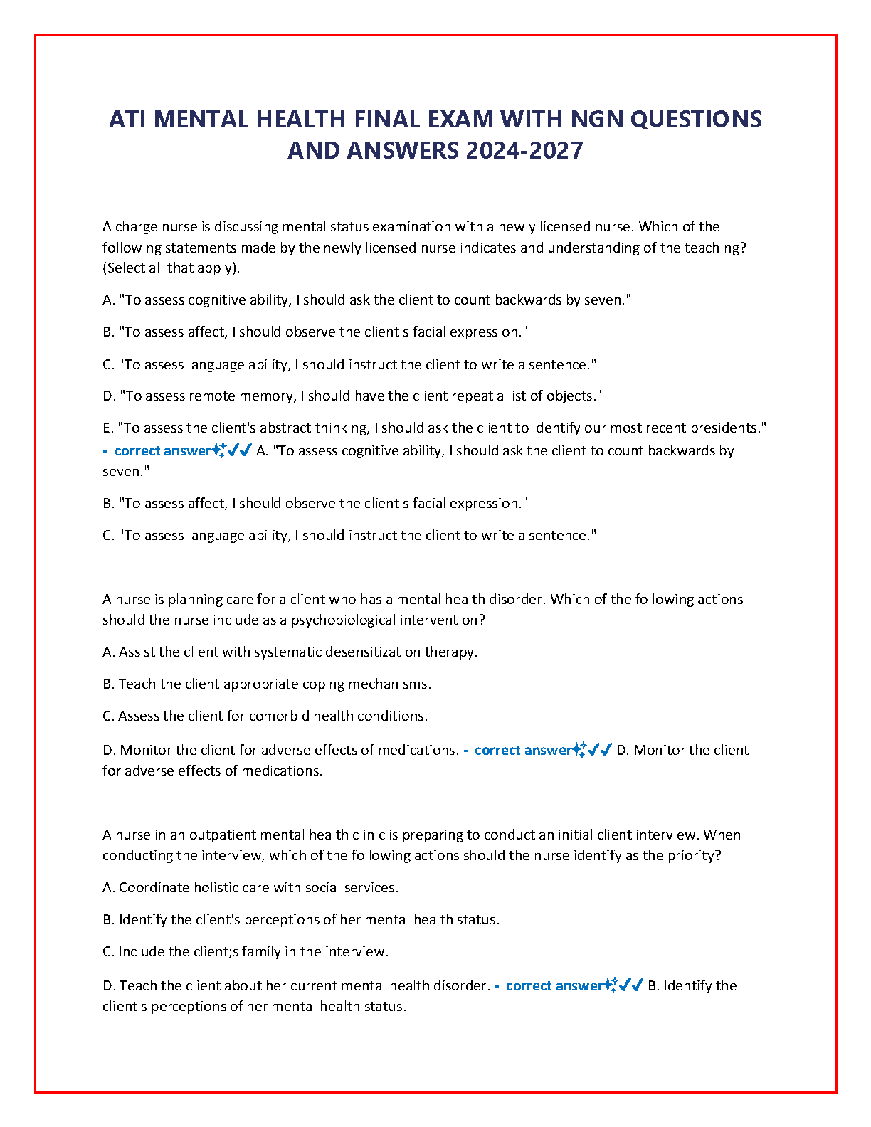 ATI Mental Health Final Exam 2024-2027: Complete NGN Questions and Answers Test Bank