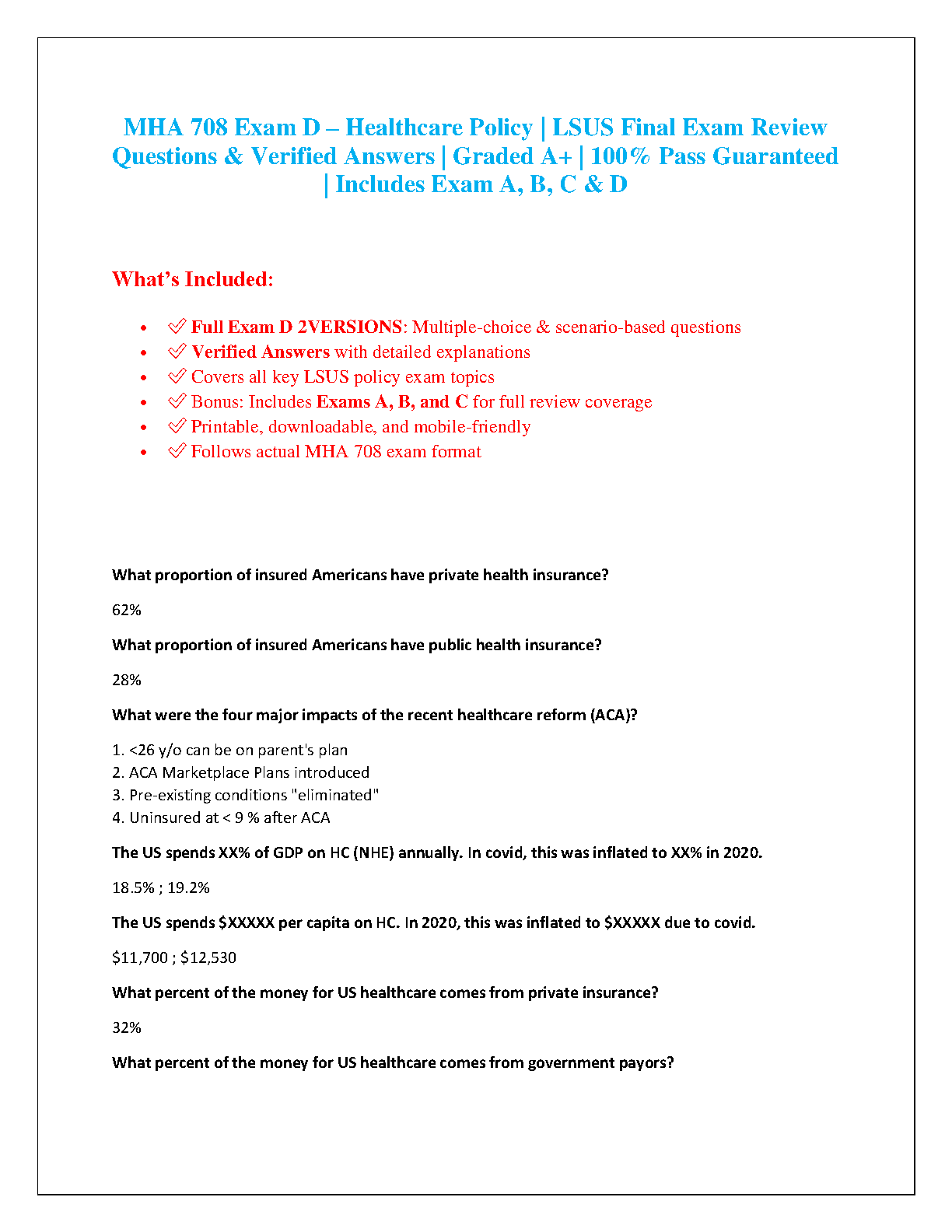 Excel in your LSUS MHA 708 Healthcare Policy course with this all-inclusive final exam test bank. This comprehensive study package provides everything you need to succeed, featuring a complete collection of questions for Exams A, B, C, and D. It includes two distinct versions of Exam D, all with verified, detailed answers to ensure a thorough understanding of the material. Covering all essential course topics and mirroring the actual exam format with both multiple-choice and scenario-based questions, this resource is your key to a guaranteed A+. Downloadable, printable, and perfectly formatted for on-the-go study.