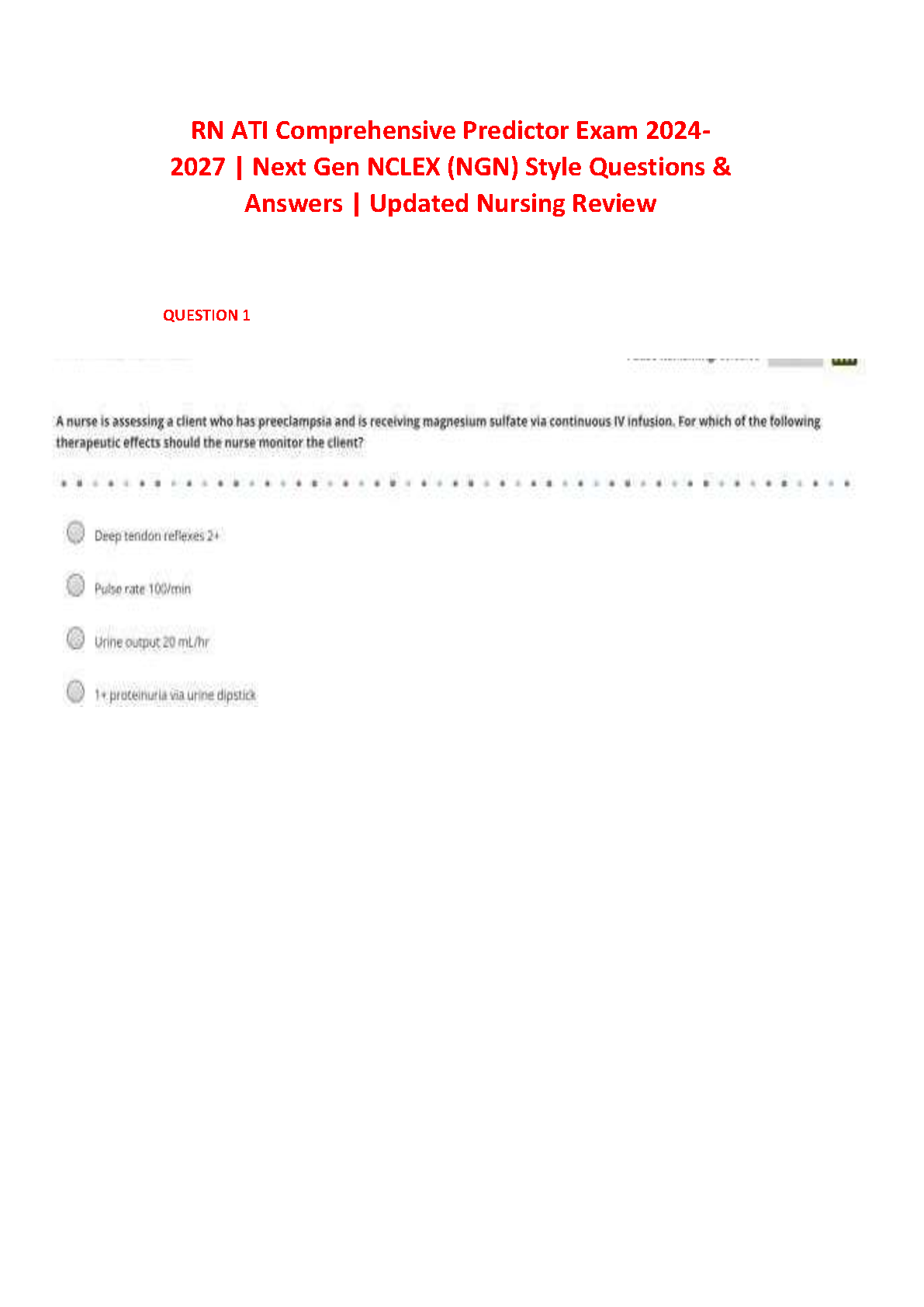 Ace your nursing exams with the most up-to-date test bank for the RN ATI Comprehensive Predictor Exam. This 2024-2027 edition from Assessment Technologies Institute (ATI) is specifically designed with Next Gen NCLEX (NGN) style questions and detailed, verified answers. Master key nursing concepts, build your confidence, and pass the ATI predictor on your first try. This comprehensive review is your ultimate study partner to avoid resits and excel in your nursing career.