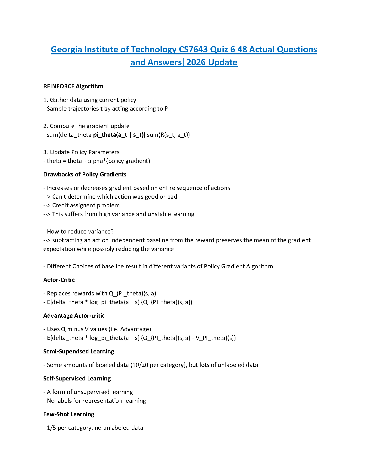 Ace your CS7643 Deep Learning quiz at Georgia Institute of Technology! This comprehensive test bank for Quiz 6 provides 48 actual questions paired with detailed, verified answers, fully updated for the 2026 academic year. Master key concepts including the REINFORCE algorithm, drawbacks of Policy Gradients, Actor-Critic methods, and various learning strategies. Designed for success, this study guide is your ultimate resource to practice with real exam questions and pass your quiz on the first attempt.