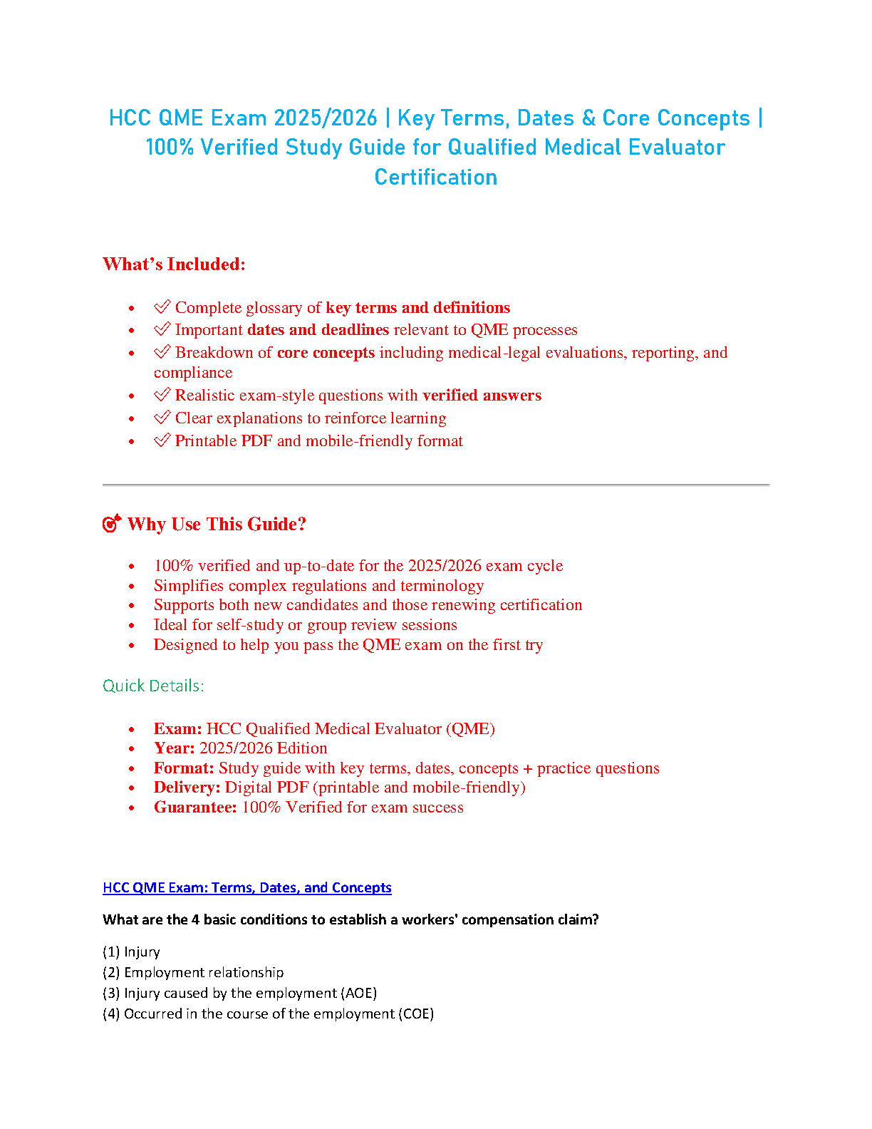 Ace your Qualified Medical Evaluator (QME) certification with our comprehensive HCC QME Exam Study Guide for the 2025/2026 academic year. This guide is expertly designed to ensure you pass on your first attempt, eliminating the need for costly resits. Inside, you'll find a complete breakdown of essential content, including a detailed glossary of key terms, critical dates and deadlines, and an in-depth explanation of core concepts related to medical-legal evaluations. Reinforce your learning with realistic practice questions featuring 100% verified answers and clear, concise explanations. This digital PDF guide is perfect for both first-time candidates and professionals seeking recertification. Start your successful journey to becoming a QME today!