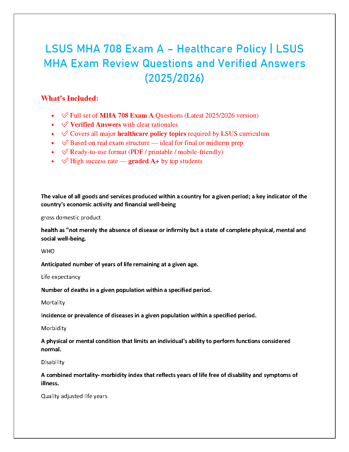 Instantly download the complete and verified test bank for LSUS MHA 708 Exam A - Healthcare Policy. This ultimate study guide, updated for the 2025/2026 academic year, provides a full set of exam questions with detailed, rationalized answers. Expertly designed to cover all essential topics from the LSUS curriculum, this resource mirrors the real exam structure, making it the perfect tool for your final or midterm preparation. Achieve an A+ grade with this proven, high-success-rate material used by top students. The user-friendly PDF format is printable and mobile-accessible for studying on the go. Master healthcare policy and pass your MHA 708 exam with confidence!