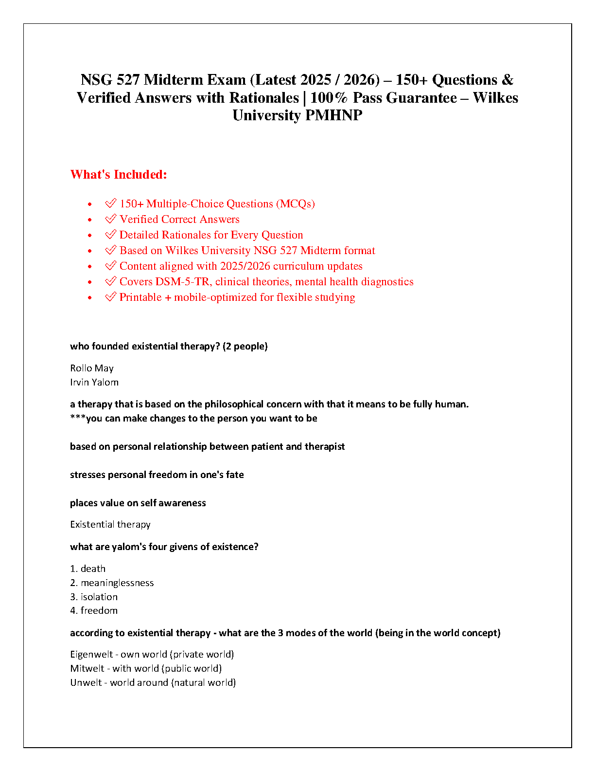 Prepare to excel in your Wilkes University PMHNP program with our comprehensive study guide for the NSG 527 Midterm Exam. This resource is fully updated for the 2025/2026 curriculum and designed to ensure your success. It features over 150 meticulously crafted multiple-choice questions, each with a verified correct answer and an in-depth rationale to deepen your understanding. Covering key topics like DSM-5-TR, clinical theories, and essential mental health diagnostics, this guide is your ultimate tool for passing on the first attempt. Download now for a printable and mobile-optimized format for studying on the go.
