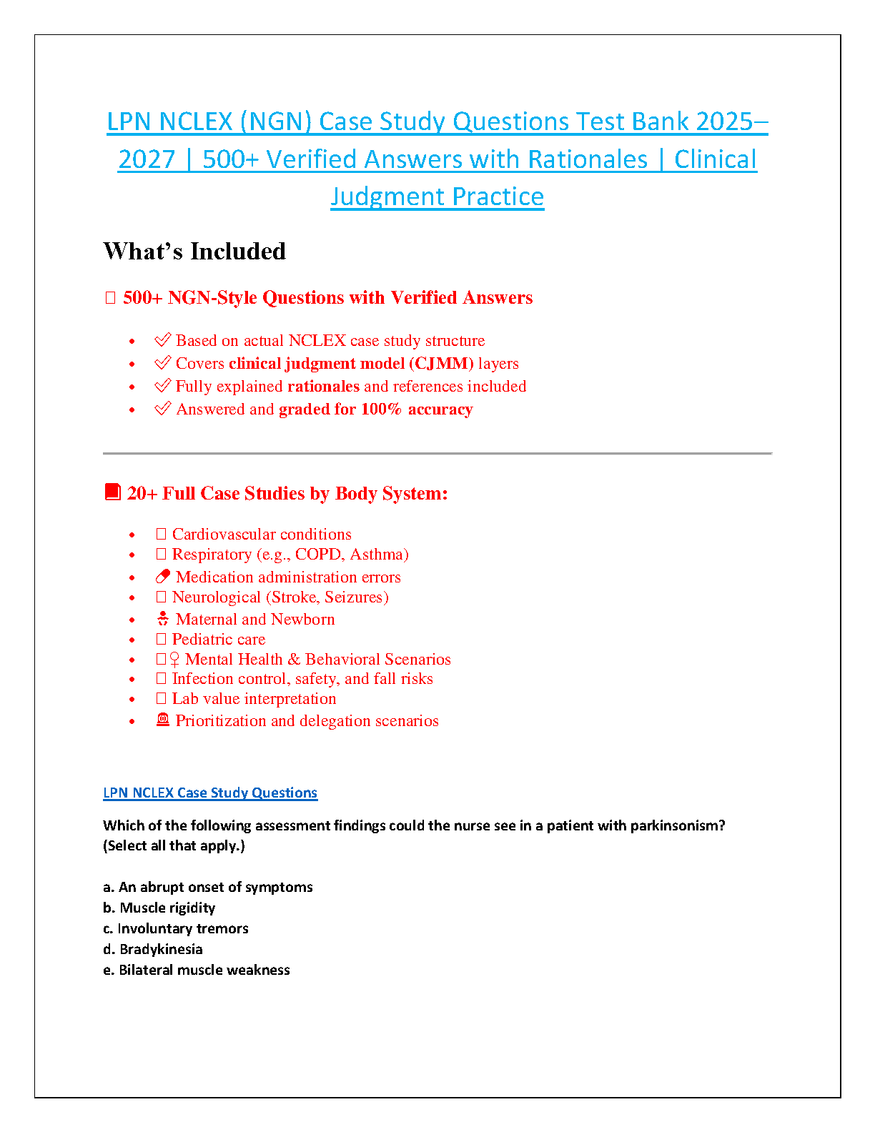 Prepare to ace the LPN Next Generation NCLEX with our comprehensive 2025-2027 test bank. This essential study resource features over 500 NGN-style case study questions, each with verified answers and in-depth rationales to build your clinical judgment skills. Dive deep into more than 20 complete case studies organized by body system, covering critical areas such as cardiovascular, respiratory, pediatric, and mental health nursing. Our questions are meticulously crafted to mirror the official NCLEX format and the Clinical Judgment Measurement Model (CJMM), ensuring you are fully prepared. Each answer is 100% accurate and includes references, providing a solid foundation for your learning. Master complex topics like medication administration, lab value interpretation, and prioritization scenarios to confidently pass your LPN NCLEX exam on the first try.