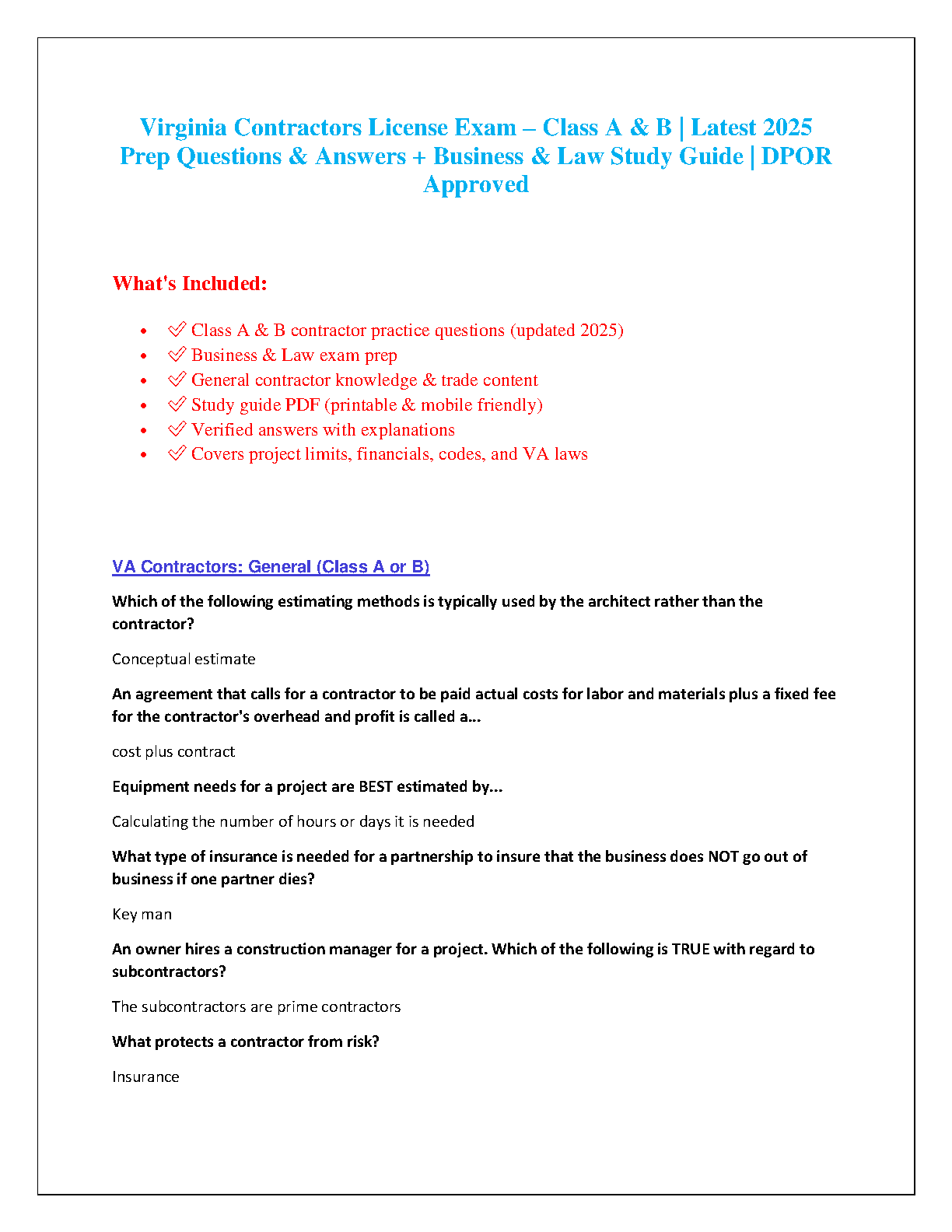 Ace your Virginia Class A & B Contractors License Exam on the first try with our comprehensive 2025 Test Bank. This DPOR-aligned study guide is your ultimate resource, packed with up-to-date practice questions and verified answers with detailed explanations. Covering all essential topics including Business & Law, general contractor knowledge, project limits, financials, and Virginia codes, this printable and mobile-friendly PDF ensures you are fully prepared. Stop worrying about resits and start your contracting career with confidence. Master the material and pass your exam with ease!