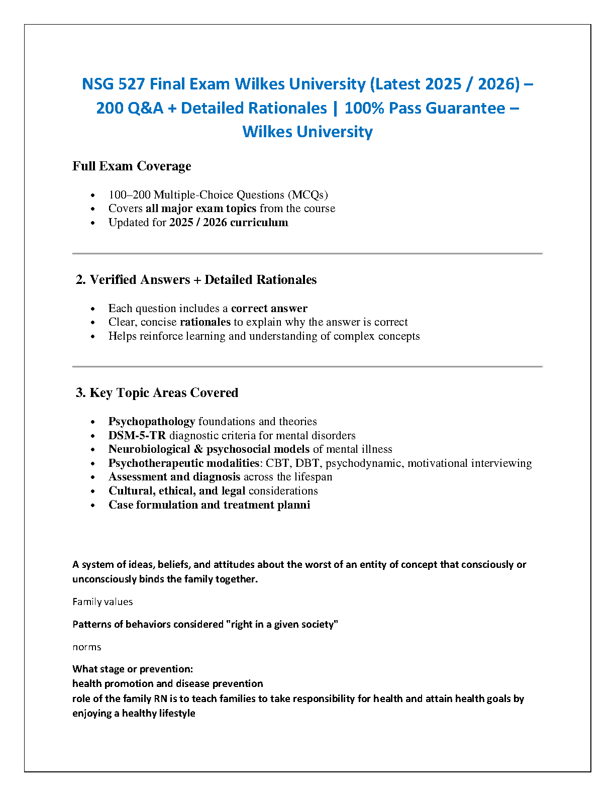 Prepare to pass your NSG 527 Final Exam at Wilkes University with confidence! This comprehensive study guide, fully updated for the 2025/2026 academic year, is your ultimate tool for success. Featuring over 200 meticulously crafted multiple-choice questions, each paired with a verified answer and in-depth rationale, this resource is designed to ensure you pass on your first attempt. Dive deep into all key course topics, including psychopathology foundations, DSM-5-TR criteria, neurobiological models, psychotherapeutic modalities like CBT and DBT, and crucial ethical considerations. Our clear, concise explanations will demystify complex concepts, reinforcing your learning and building the knowledge you need to excel. Stop worrying about resits and start studying smarter with this essential guide to acing your NSG 527 final.
