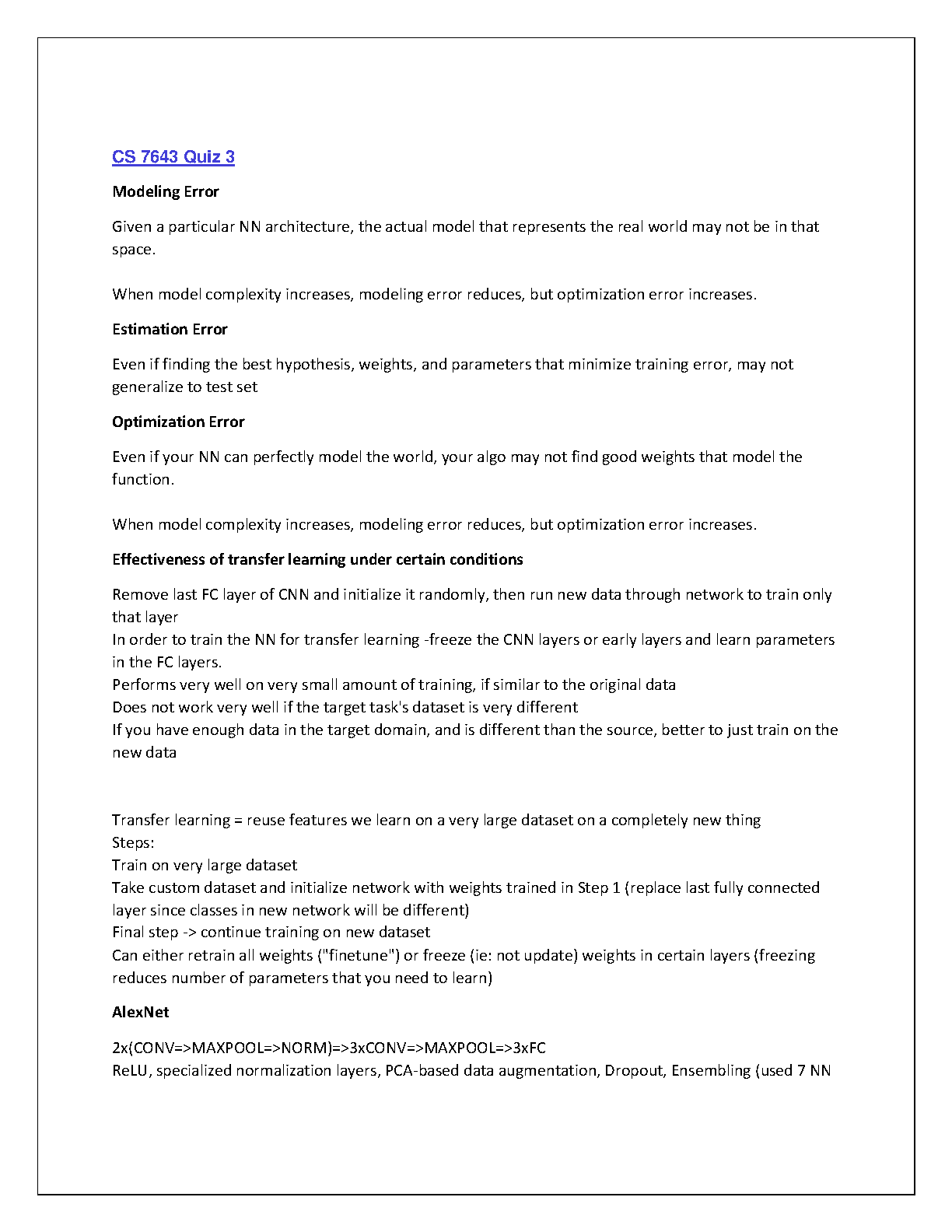Ace your CS 7643 Deep Learning exam with our expertly crafted study guide for Quiz 3, updated for the 2025/2026 academic year. This resource is designed to help you pass on your first attempt by providing clear, concise explanations of essential topics. Master key concepts such as Modeling, Estimation, and Optimization Errors, understand the effectiveness and practical steps of Transfer Learning, and get a detailed breakdown of the AlexNet architecture. Secure the grade you deserve and avoid resits with this ultimate study companion.