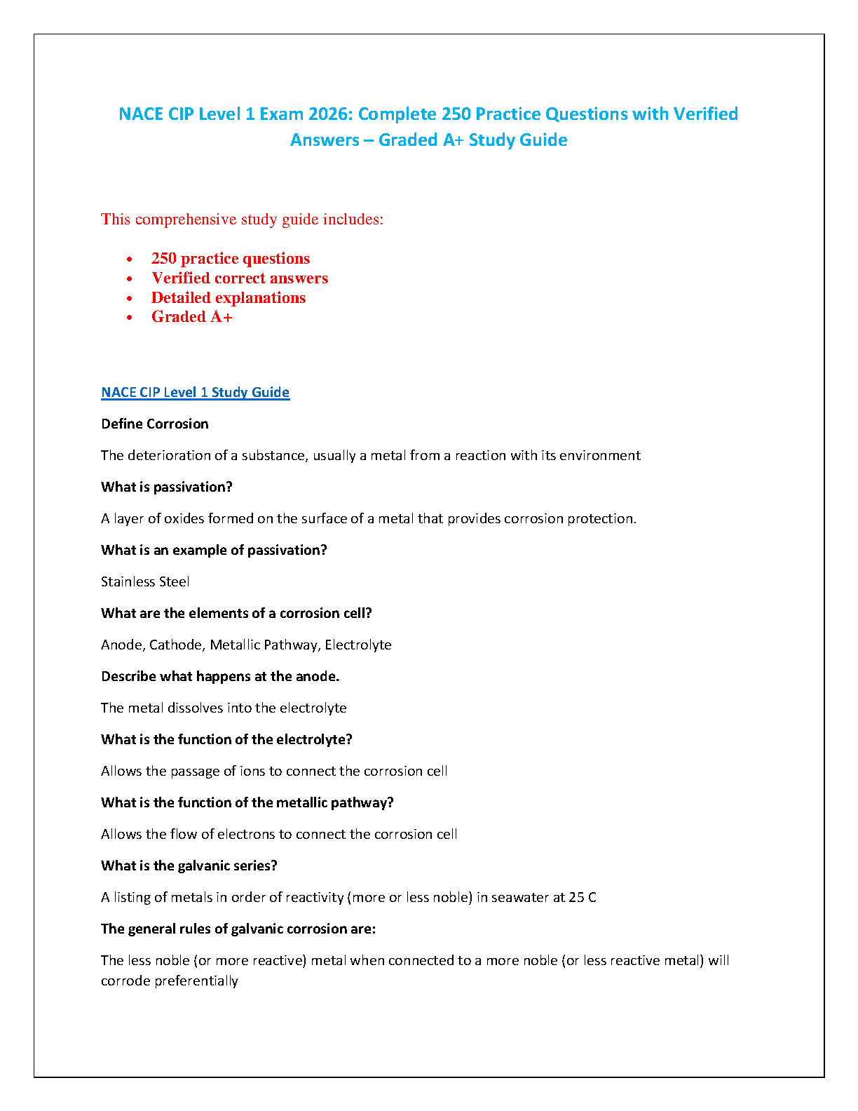 Ace your NACE Coating Inspector Program (CIP) Level 1 certification exam with our comprehensive 2026 test bank! This essential study resource provides you with 250 meticulously crafted practice questions, each paired with a verified answer and in-depth explanation. Designed to mirror the actual exam format, this guide covers all critical topics, from the fundamentals of corrosion to passivation and galvanic series. Stop worrying about resits and start studying smart. Our A+ graded material is the key to mastering the content and passing your NACE CIP Level 1 exam on the first try. Download now for immediate access to the ultimate preparation tool.