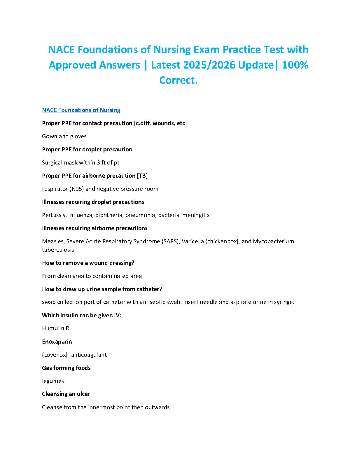 Unlock exam success with our latest NACE Foundations of Nursing Exam Test Bank for the 2025/2026 academic year. This comprehensive study guide is packed with practice questions and 100% correct, verified answers, covering all essential topics. Master crucial concepts like infection control (PPE for contact, droplet, and airborne precautions), wound care techniques, medication administration including insulin and anticoagulants, and fundamental patient safety procedures. Our resource is expertly designed to help you study efficiently, build confidence, and pass your NACE exam on the very first attempt. Avoid resits and fast-track your nursing career with this essential preparation tool.