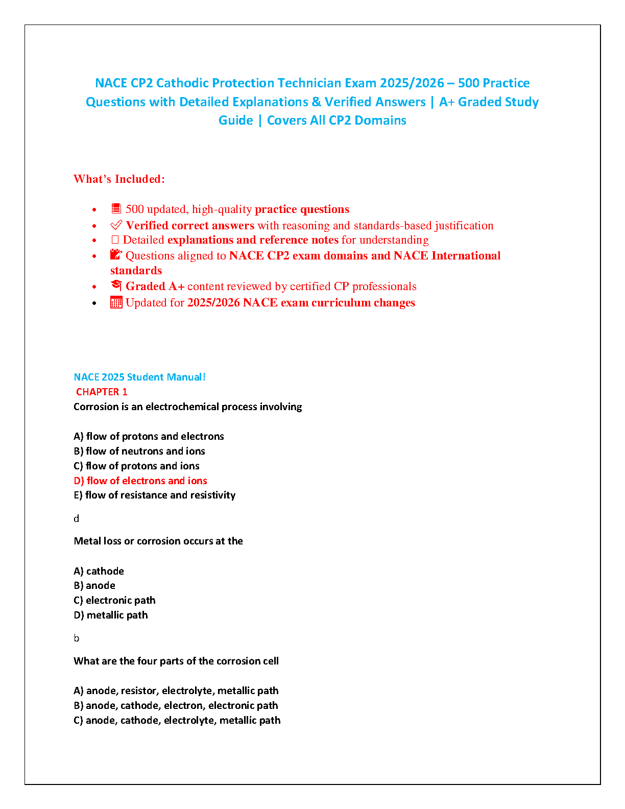NACE CP2 Test Bank 2025/2026 Edition: Cathodic Protection Technician Exam Study Guide with 500+ Practice Questions & Verified Answers