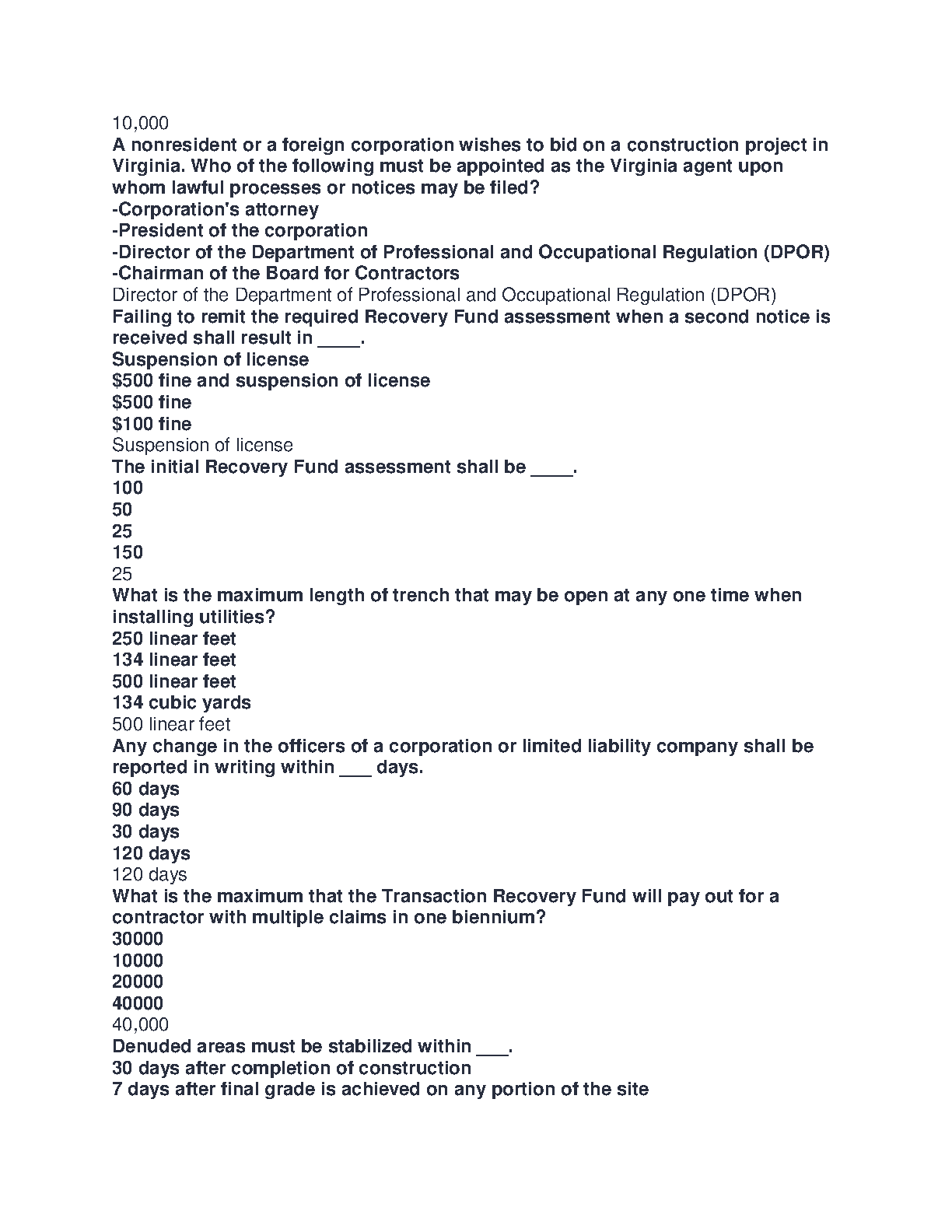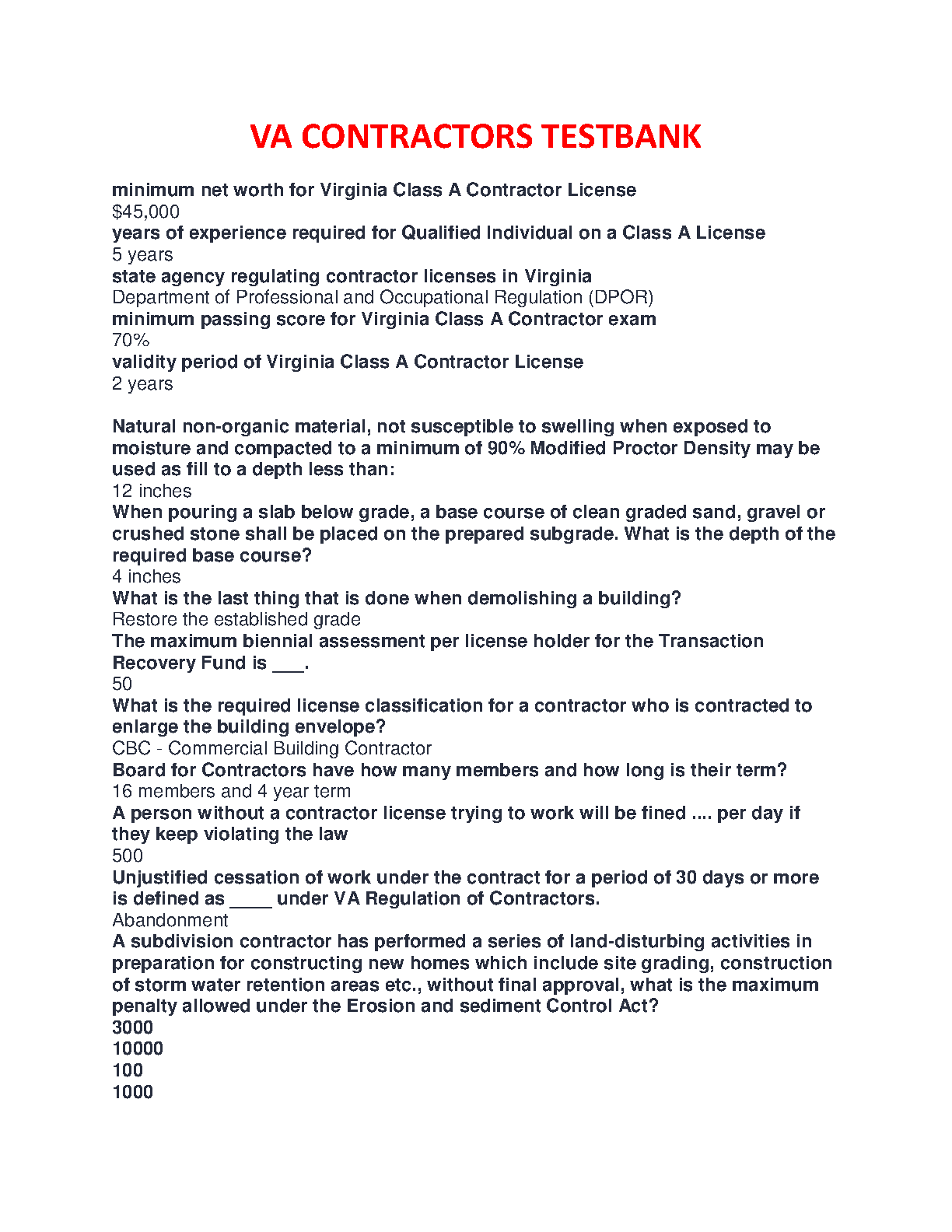 Prepare to ace your Virginia Contractor License Exam with our comprehensive test bank. This study guide is packed with hundreds of practice questions and verified answers, covering all the essential topics you'll face on the test administered by the Virginia DPOR. Master key areas such as licensing requirements for Class A, B, and C contractors, business and law regulations, construction practices, safety protocols, and financial management. Our detailed Q&A format allows you to test your knowledge, identify weak spots, and build the confidence needed to pass your exam on the first try. Get immediate access to the ultimate study tool for aspiring Virginia contractors.