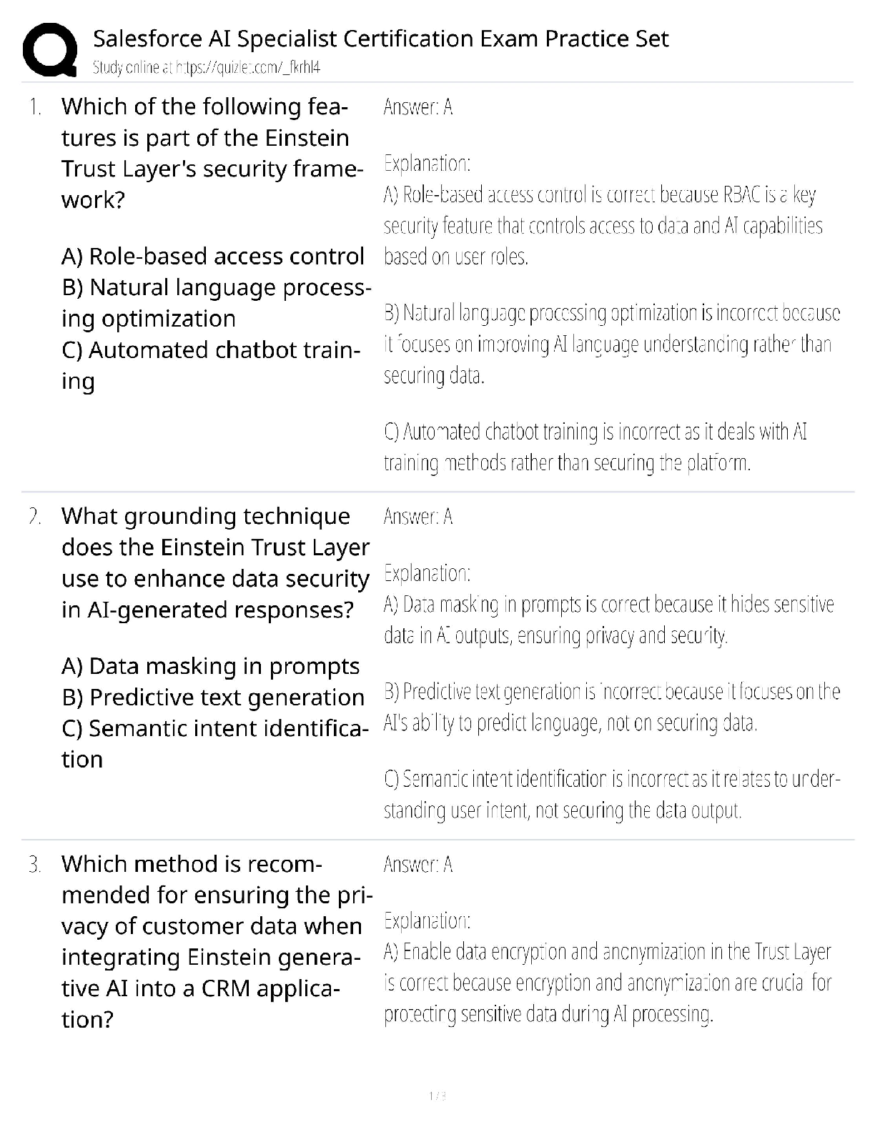 Unlock your potential and conquer the Salesforce AI Specialist Certification with our premier 2025/2026 test bank. This essential study guide is packed with verified practice questions and in-depth explanations covering all core exam domains, including the Einstein Trust Layer, generative AI security, and data privacy protocols. Each question is crafted to simulate the actual exam environment, providing you with the confidence and knowledge needed to excel. Stop worrying about resits—prepare effectively with our targeted Q&A resource and pass your certification on the first try!