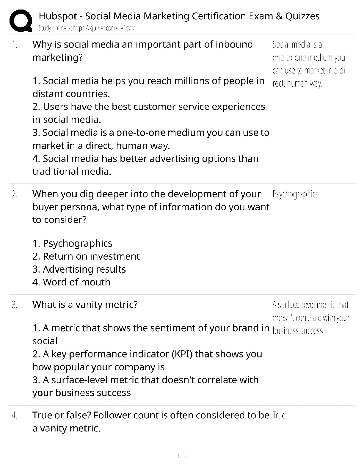 Unlock your career in digital marketing by acing the Hubspot Social Media Marketing Certification exam on your first try! This is our latest and most comprehensive test bank for the 2025/2026 Hubspot Social Media Marketing Certification. It features a complete collection of real exam questions and professionally verified answers. Our guide covers all essential topics, including inbound marketing strategies, developing buyer personas, understanding vanity metrics vs. KPIs, and much more. Each question is designed to mirror the actual exam format, helping you build confidence and identify areas for improvement. Stop wasting time on outdated materials and get the exact resource you need to pass with flying colors. Perfect for students and professionals looking for a reliable and efficient study tool to get certified without the stress of retakes. Download now and take the first step towards becoming a Hubspot certified expert!