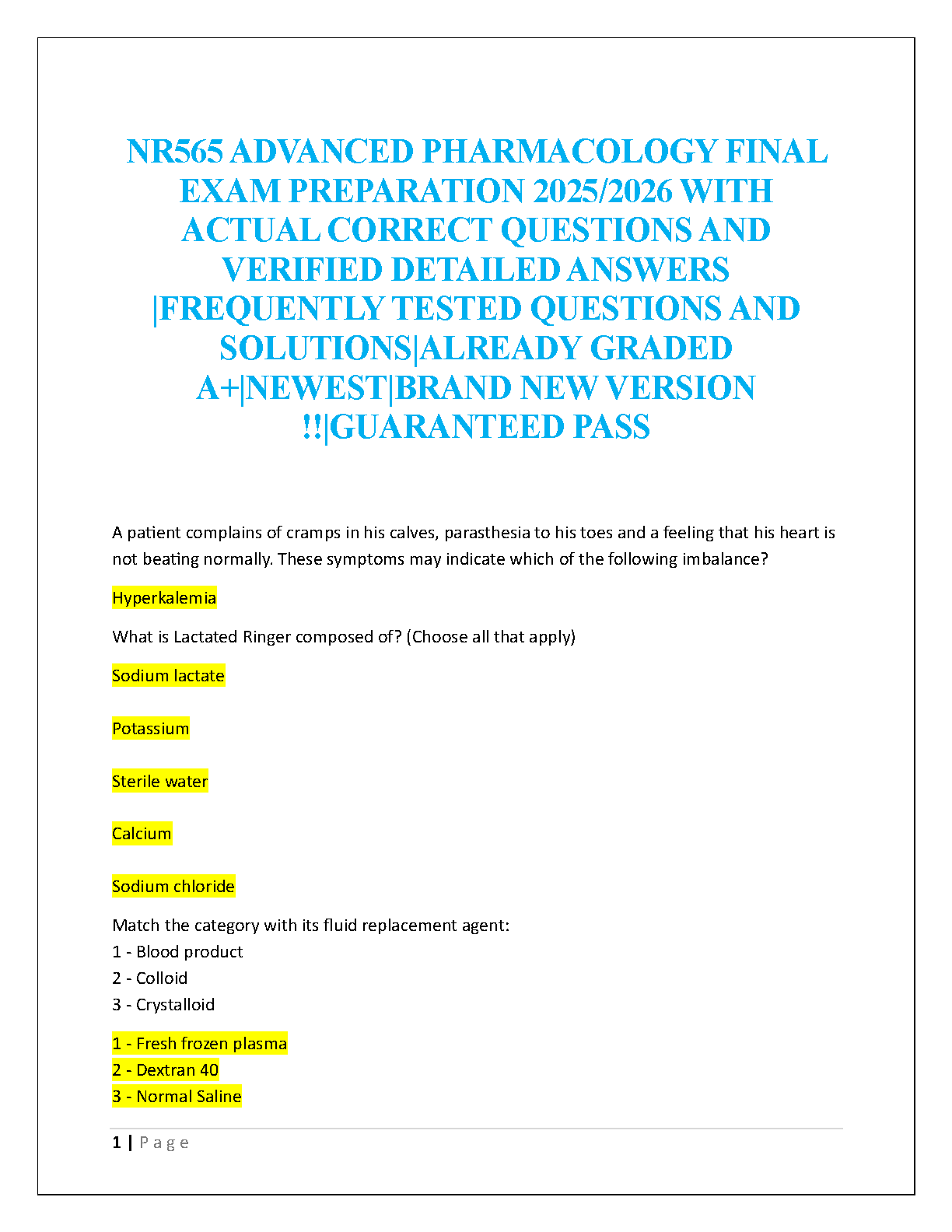 Master your NR565 Advanced Pharmacology final exam with this comprehensive study guide, fully updated for the 2025/2026 academic year. This essential resource provides a complete collection of actual exam questions paired with meticulously verified, detailed answers and solutions. Designed to ensure you pass on your first attempt, this guide covers all the frequently tested topics and complex concepts you need to know. Achieve an A+ grade and avoid resits by preparing with the most accurate and up-to-date material available for NR565. Get instant access and start studying smart for guaranteed success!