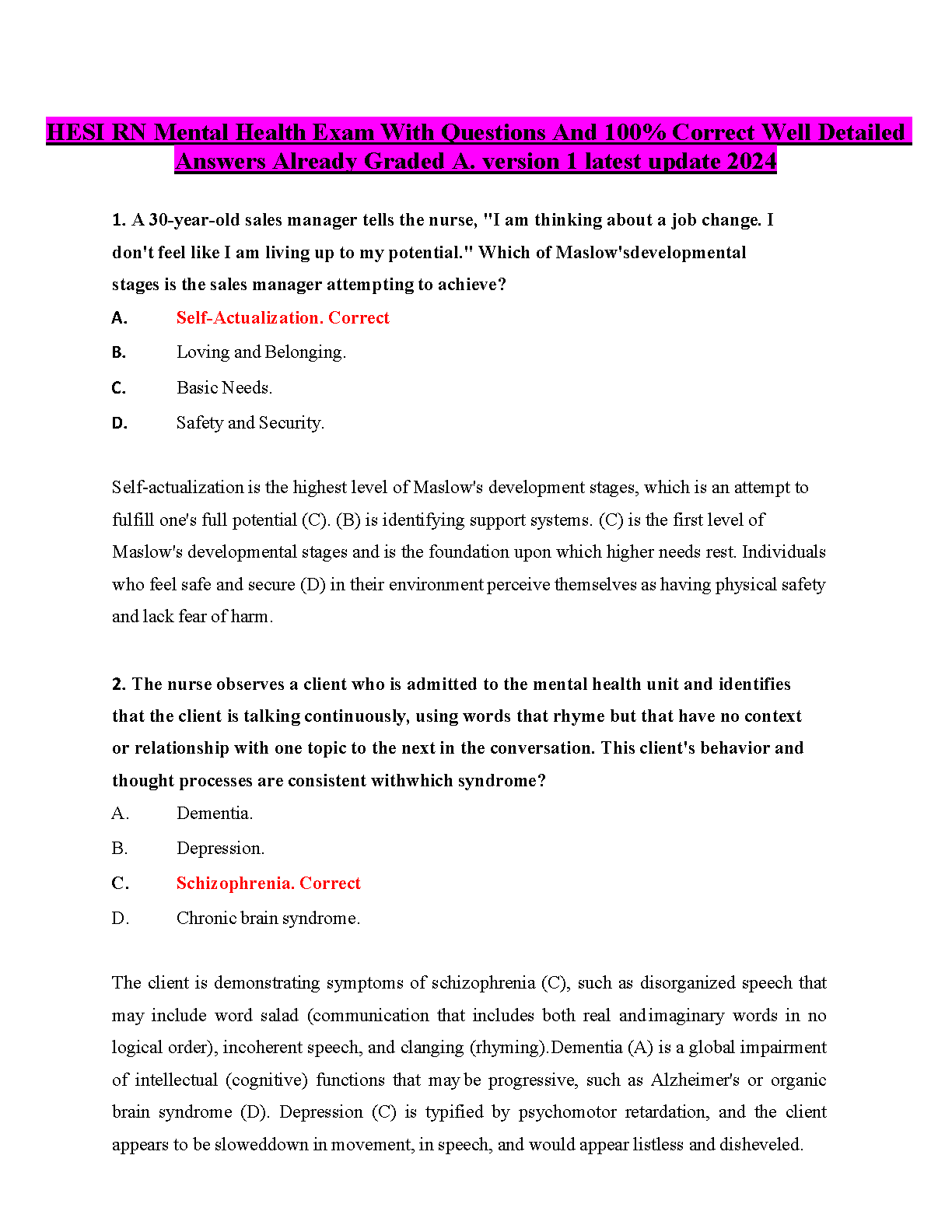 Ace your HESI RN Mental Health exam with our latest 2024 test bank (Version 1)! This comprehensive study guide is your key to success, featuring a complete set of questions with 100% correct, verified answers and in-depth, detailed rationales for each. Designed to help you grasp complex mental health nursing concepts, this resource has been proven to help students achieve a Grade A. Stop worrying about resits and prepare effectively to pass your exam with confidence on the very first attempt. Download now and take the first step towards mastering your HESI mental health assessment.
