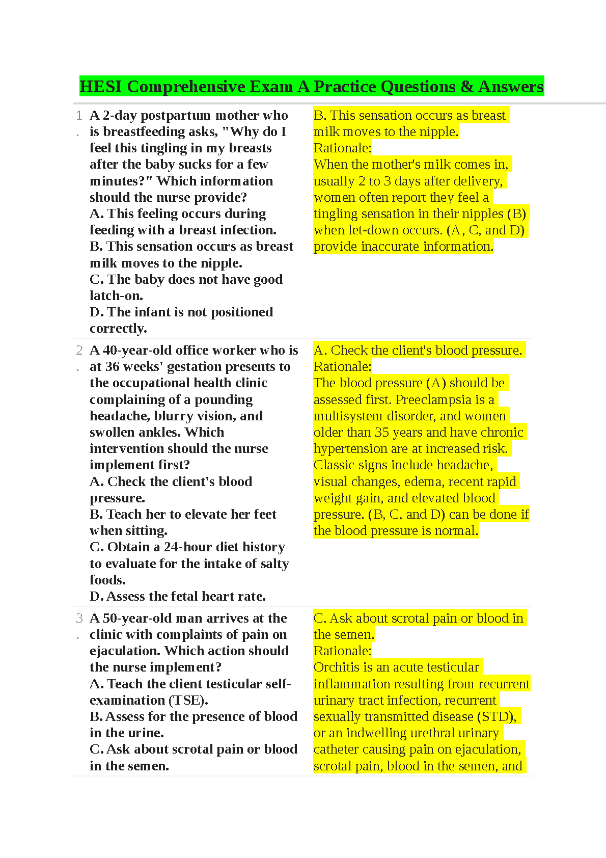 Ace your HESI Comprehensive Exam with confidence! This essential study guide for the 2025/2026 academic year provides a complete set of practice questions and detailed, expert-verified answers. Each question comes with a clear rationale, breaking down complex nursing concepts to ensure you understand the 'why' behind each answer. This resource is expertly designed to cover critical topics you'll face on the exam, helping you to identify knowledge gaps, build critical thinking skills, and guarantee success on your first attempt. Stop worrying about resits and start preparing effectively today!