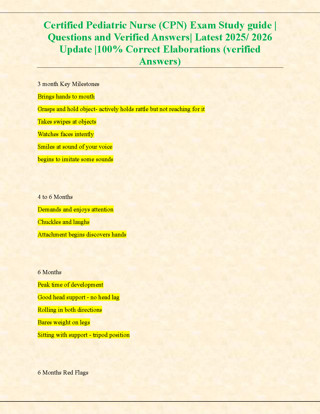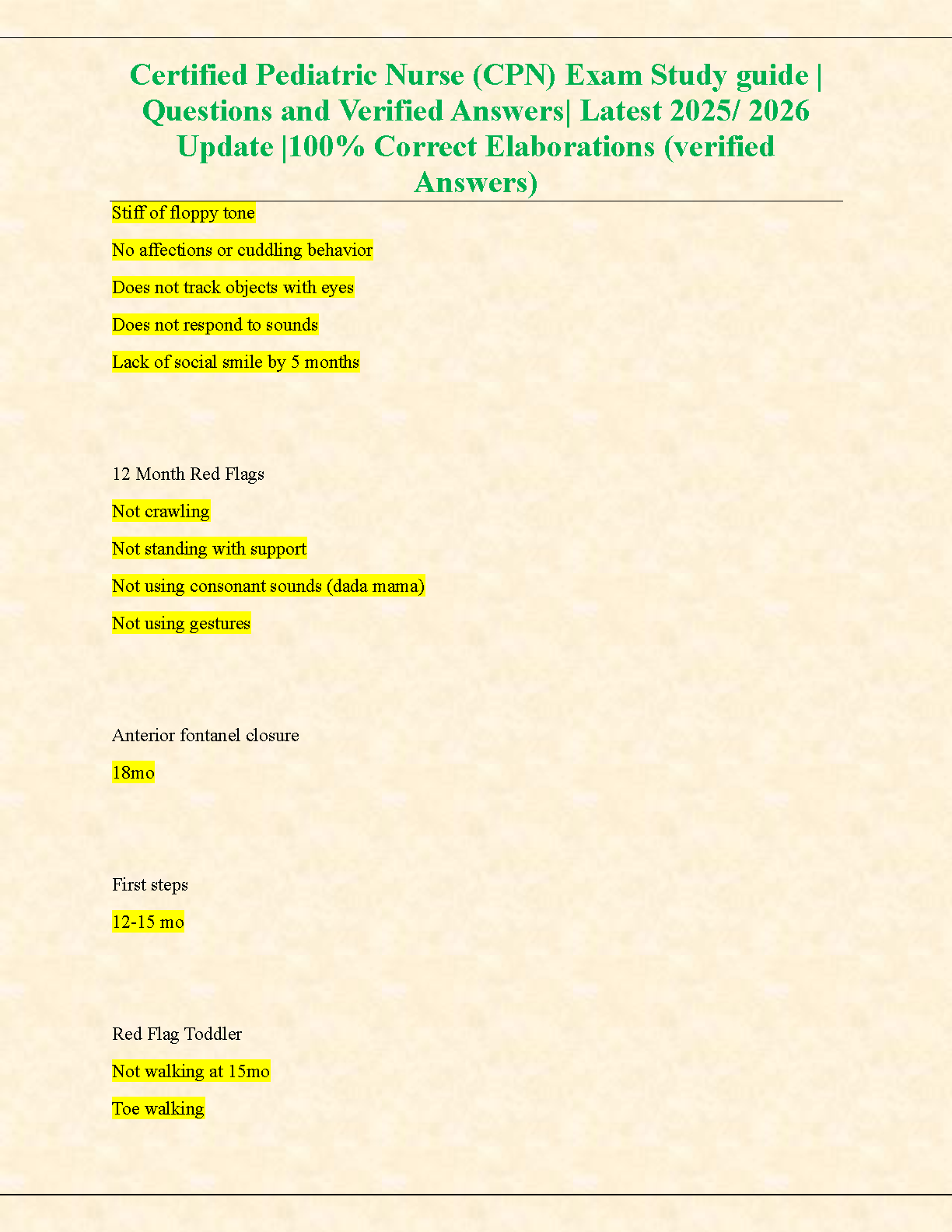 Ace your Certified Pediatric Nurse (CPN) exam on the first attempt with our comprehensive 2025/2026 test bank. This study guide features an extensive collection of exam questions paired with 100% correct, verified answers and detailed elaborations. Master crucial pediatric nursing topics, including key infant developmental milestones, to ensure you're fully prepared. This resource is expertly designed to help you study effectively, build confidence, and pass your CPN certification exam with ease, avoiding costly resits.