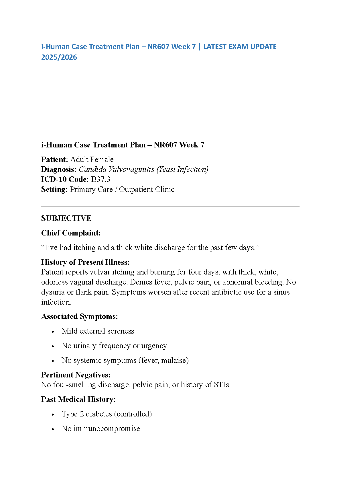 NR607 Week 7 i-Human Case Study: Candida Vulvovaginitis (Yeast Infection) Treatment Plan | Latest 2025/2026 Guide to Ace Your Exams