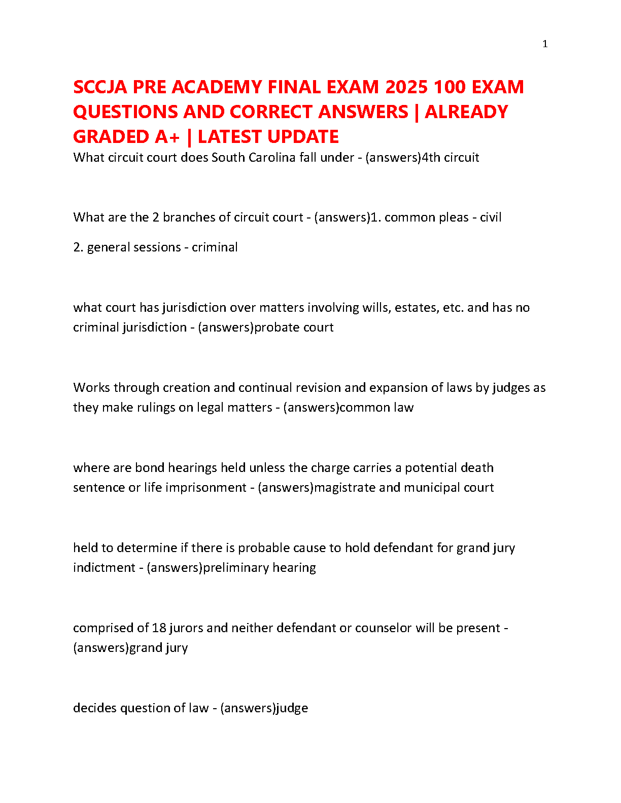 Pass your SCCJA Pre Academy Final Exam with confidence using this 2025 Test Bank. This comprehensive study guide contains 100 exam questions complete with verified, A+ graded answers. It's the latest updated version, covering all essential topics to ensure you are fully prepared. Unlock your path to success in the South Carolina Criminal Justice Academy and achieve a top score on your final exam. This is the ultimate resource for guaranteed success.