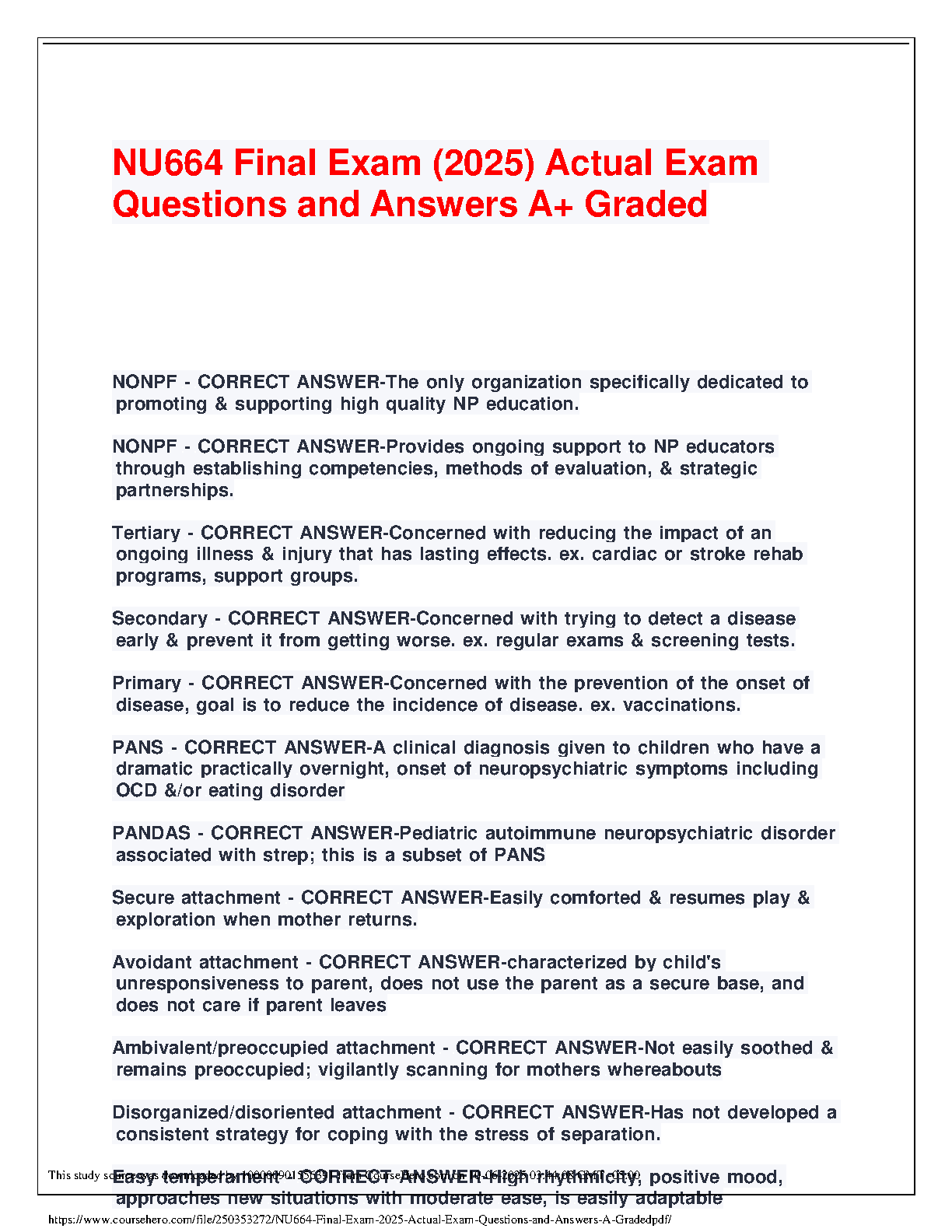 Ace your NU664 Final Exam with this comprehensive 2025 test bank! This A+ graded resource provides a complete set of actual exam questions and verified correct answers, designed to help Psychiatric Mental Health Nurse Practitioner (PMHNP) students succeed. Covering crucial topics such as NONPF standards, levels of prevention, pediatric conditions like PANS and PANDAS, and key psychological concepts including attachment theories, this study guide is your ultimate tool for exam preparation. Download now to study effectively, master the material, and pass your NU664 final with confidence.
